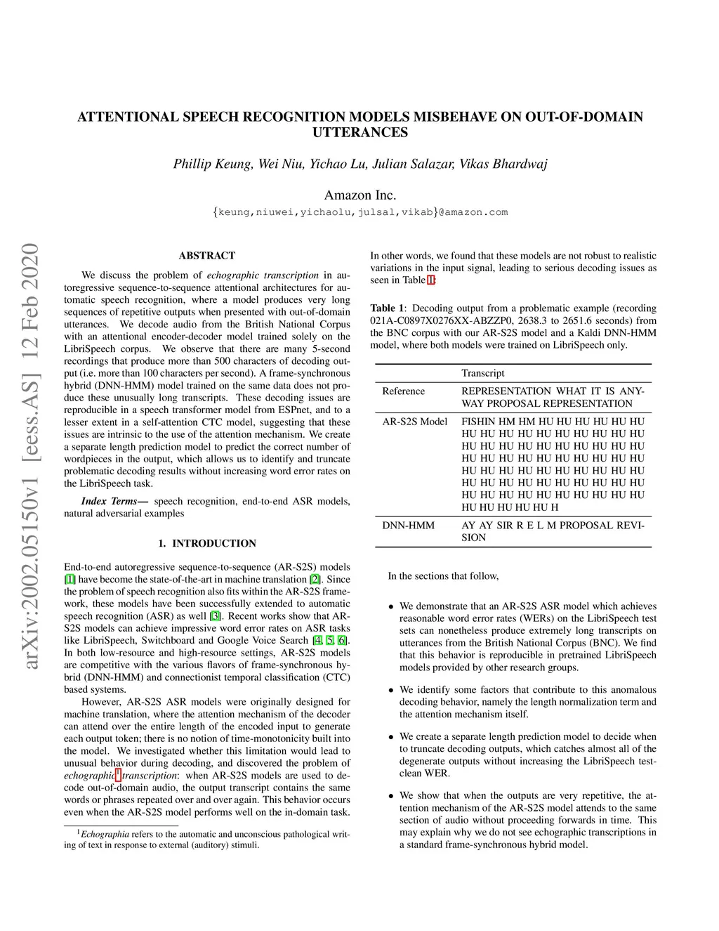 We discuss the problem of echographic transcription in autoregressive sequence-to-sequence attentional architectures for automatic speech recognition, where a model produces very long sequences of repetitive outputs when presented with out-of-domain utterances. We decode audio from the British National Corpus with an attentional encoder-decoder model trained solely on the LibriSpeech corpus. We observe that there are many 5-second recordings that produce more than 500 characters of decoding output (i.e. more than 100 characters per second). A frame-synchronous hybrid (DNN-HMM) model trained on the same data does not produce these unusually long transcripts. These decoding issues are reproducible in a speech transformer model from ESPnet, and to a lesser extent in a self-attention CTC model, suggesting that these issues are intrinsic to the use of the attention mechanism. We create a separate length prediction model to predict the correct number of wordpieces in the output, which allows us to identify and truncate problematic decoding results without increasing word error rates on the LibriSpeech task.