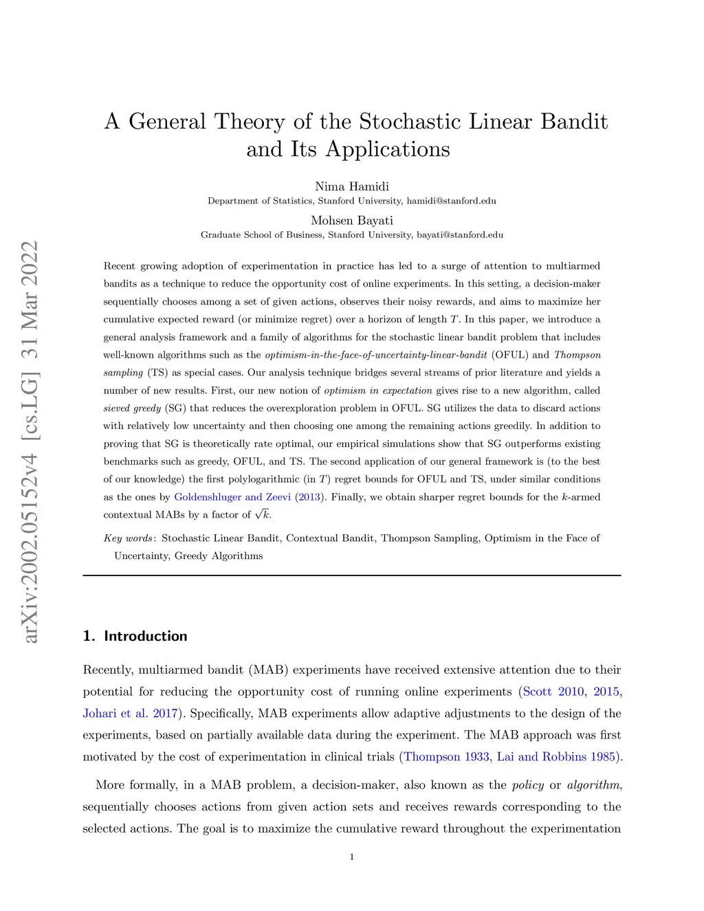 Recent growing adoption of experimentation in practice has led to a surge of attention to multiarmed bandits as a technique to reduce the opportunity cost of online experiments. In this setting, a decision-maker sequentially chooses among a set of given actions, observes their noisy rewards, and aims to maximize her cumulative expected reward (or minimize regret) over a horizon of length . In this paper, we introduce a general analysis framework and a family of algorithms for the stochastic linear bandit problem that includes well-known algorithms such as the optimism-in-the-face-of-uncertainty-linear-bandit (OFUL) and Thompson sampling (TS) as special cases. Our analysis technique bridges several streams of prior literature and yields a number of new results. First, our new notion of optimism in expectation gives rise to a new algorithm, called sieved greedy (SG) that reduces the overexploration problem in OFUL. SG utilizes the data to discard actions with relatively low uncertainty and then choosing one among the remaining actions greedily. In addition to proving that SG is theoretically rate optimal, our empirical simulations show that SG outperforms existing benchmarks such as greedy, OFUL, and TS. The second application of our general framework is (to the best of our knowledge) the first polylogarithmic (in ) regret bounds for OFUL and TS, under similar conditions as the ones by Goldenshluger and Zeevi (2013). Finally, we obtain sharper regret bounds for the -armed contextual MABs by a factor of .