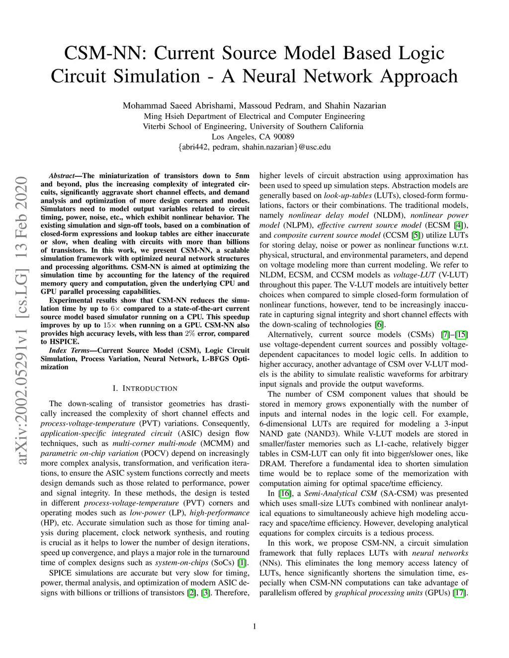 The miniaturization of transistors down to 5nm and beyond, plus the increasing complexity of integrated circuits, significantly aggravate short channel effects, and demand analysis and optimization of more design corners and modes. Simulators need to model output variables related to circuit timing, power, noise, etc., which exhibit nonlinear behavior. The existing simulation and sign-off tools, based on a combination of closed-form expressions and lookup tables are either inaccurate or slow, when dealing with circuits with more than billions of transistors. In this work, we present CSM-NN, a scalable simulation framework with optimized neural network structures and processing algorithms. CSM-NN is aimed at optimizing the simulation time by accounting for the latency of the required memory query and computation, given the underlying CPU and GPU parallel processing capabilities. Experimental results show that CSM-NN reduces the simulation time by up to compared to a state-of-the-art current source model based simulator running on a CPU. This speedup improves by up to when running on a GPU. CSM-NN also provides high accuracy levels, with less than error, compared to HSPICE.