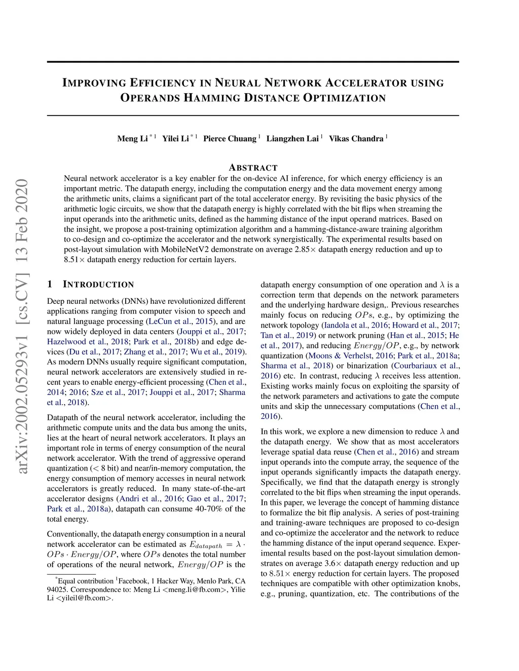 Neural network accelerator is a key enabler for the on-device AI inference, for which energy efficiency is an important metric. The data-path energy, including the computation energy and the data movement energy among the arithmetic units, claims a significant part of the total accelerator energy. By revisiting the basic physics of the arithmetic logic circuits, we show that the data-path energy is highly correlated with the bit flips when streaming the input operands into the arithmetic units, defined as the hamming distance of the input operand matrices. Based on the insight, we propose a post-training optimization algorithm and a hamming-distance-aware training algorithm to co-design and co-optimize the accelerator and the network synergistically. The experimental results based on post-layout simulation with MobileNetV2 demonstrate on average 2.85X data-path energy reduction and up to 8.51X data-path energy reduction for certain layers.