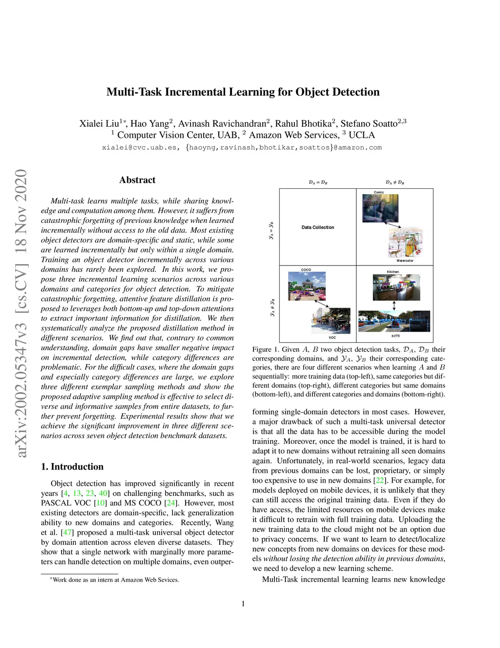 Training an object detector incrementally has hardly been explored. In this paper, we propose attentive feature distillation which leverages both bottom-up and top-down attentions to mitigate forgetting in incremental detection. Then, we systematically analyze the proposed distillation method in different scenarios across various domains and categories. We find out that, contrary to common understanding, domain gaps have relatively smaller negative impact on incremental detection, while category differences are the major problem. For the difficult cases, where the domain gaps and especially categories differences are large, we propose an adaptive exemplar sampling method to select diverse and informative samples from entire datasets, to further prevent forgetting. Experimental results show that we achieve the state-of-the-art performance in three different scenarios across seven object detection benchmark datasets.