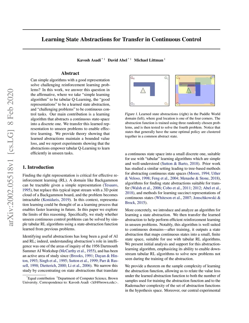 Can simple algorithms with a good representation solve challenging reinforcement learning problems? In this work, we answer this question in the affirmative, where we take "simple learning algorithm" to be tabular Q-Learning, the "good representations" to be a learned state abstraction, and "challenging problems" to be continuous control tasks. Our main contribution is a learning algorithm that abstracts a continuous state-space into a discrete one. We transfer this learned representation to unseen problems to enable effective learning. We provide theory showing that learned abstractions maintain a bounded value loss, and we report experiments showing that the abstractions empower tabular Q-Learning to learn efficiently in unseen tasks.