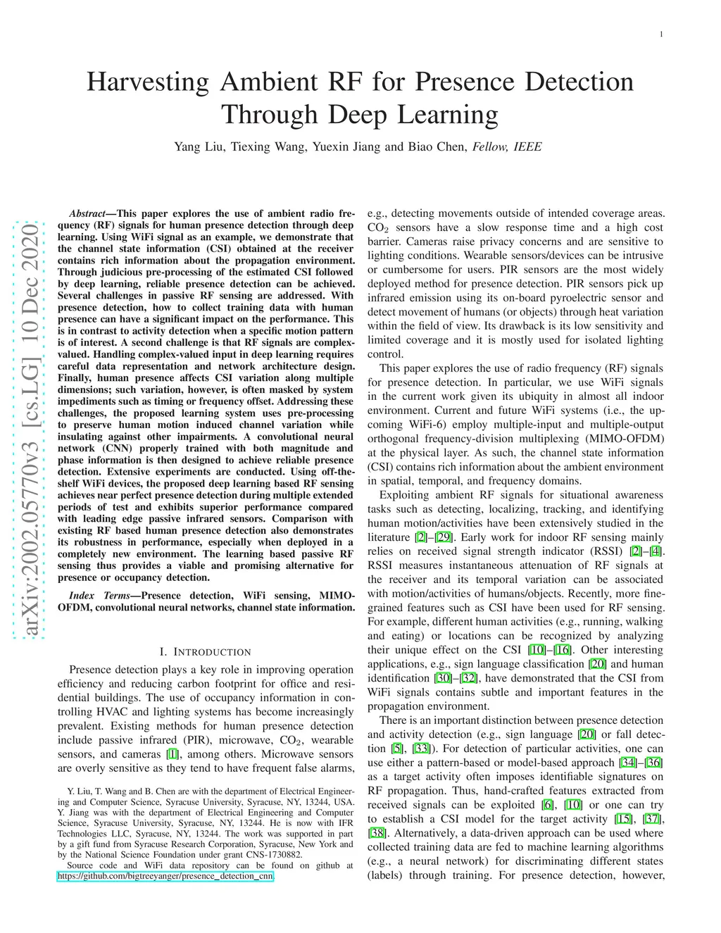 Harvesting Ambient RF for Presence Detection Through Deep Learning