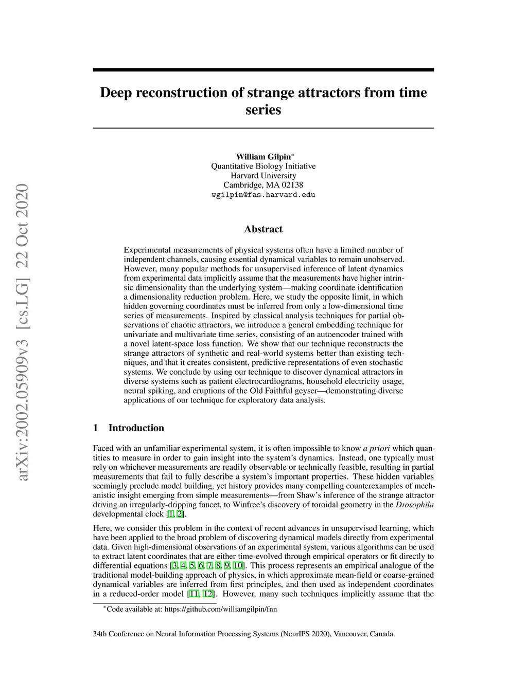Experimental measurements of physical systems often have a limited number of independent channels, causing essential dynamical variables to remain unobserved. However, many popular methods for unsupervised inference of latent dynamics from experimental data implicitly assume that the measurements have higher intrinsic dimensionality than the underlying system---making coordinate identification a dimensionality reduction problem. Here, we study the opposite limit, in which hidden governing coordinates must be inferred from only a low-dimensional time series of measurements. Inspired by classical analysis techniques for partial observations of chaotic attractors, we introduce a general embedding technique for univariate and multivariate time series, consisting of an autoencoder trained with a novel latent-space loss function. We show that our technique reconstructs the strange attractors of synthetic and real-world systems better than existing techniques, and that it creates consistent, predictive representations of even stochastic systems. We conclude by using our technique to discover dynamical attractors in diverse systems such as patient electrocardiograms, household electricity usage, neural spiking, and eruptions of the Old Faithful geyser---demonstrating diverse applications of our technique for exploratory data analysis.