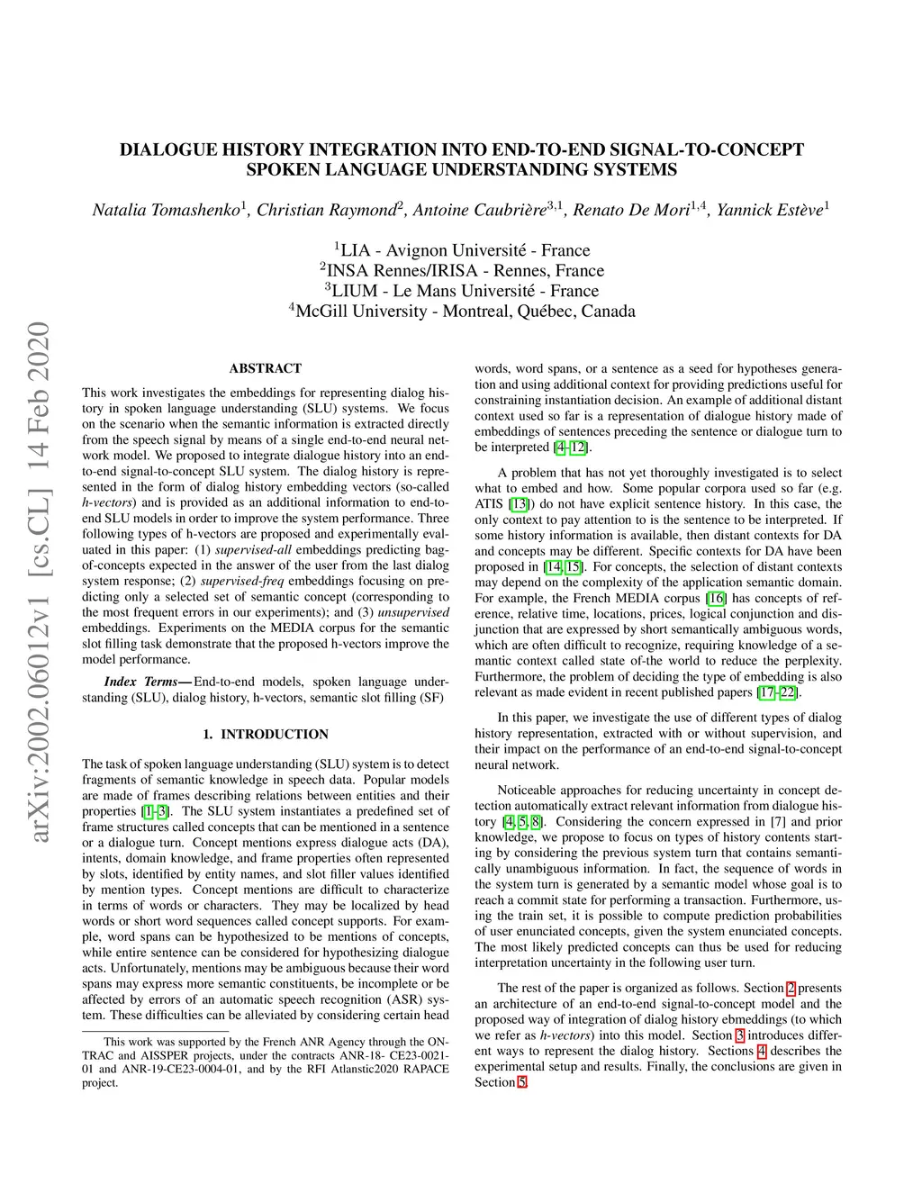 Dialogue history integration into end-to-end signal-to-concept spoken