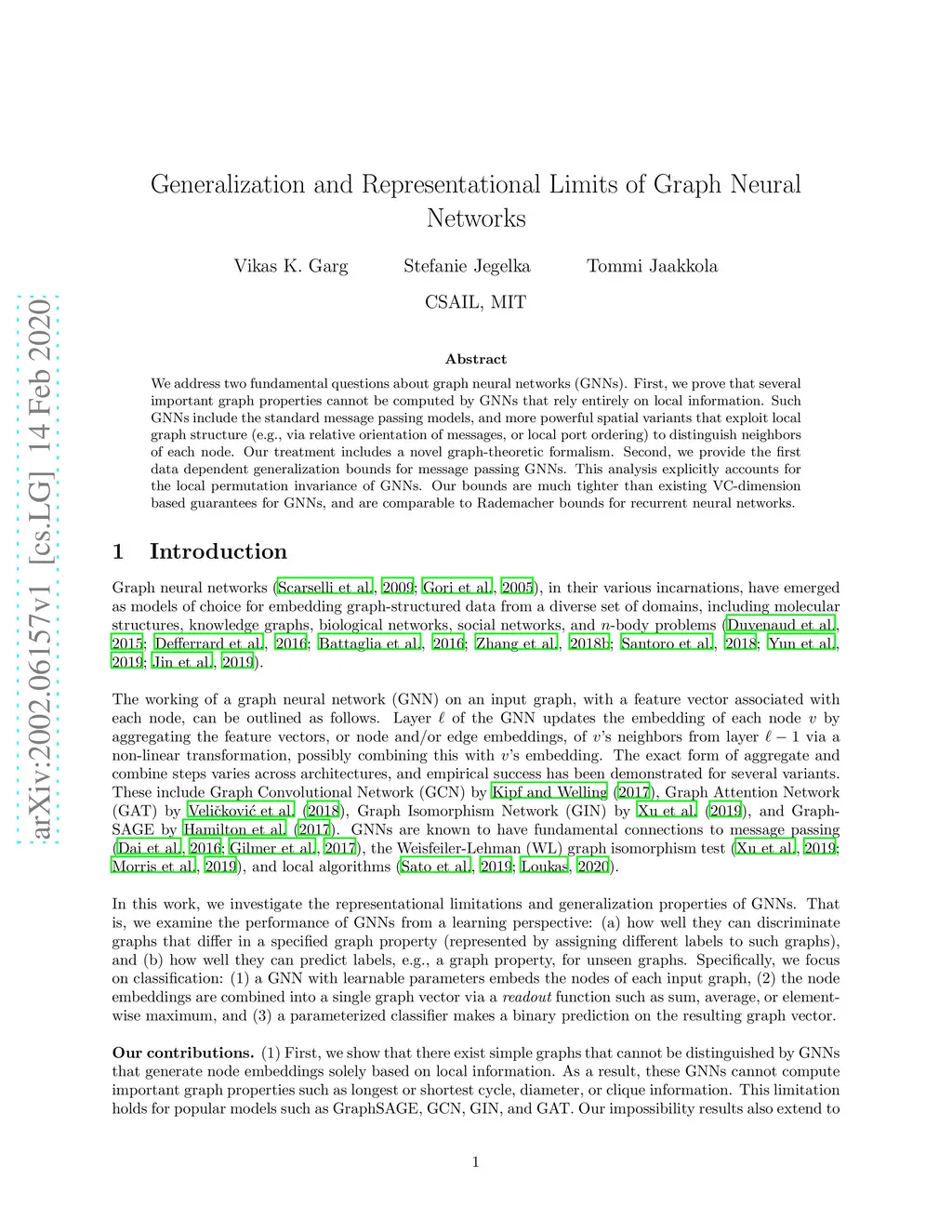 We address two fundamental questions about graph neural networks (GNNs). First, we prove that several important graph properties cannot be computed by GNNs that rely entirely on local information. Such GNNs include the standard message passing models, and more powerful spatial variants that exploit local graph structure (e.g., via relative orientation of messages, or local port ordering) to distinguish neighbors of each node. Our treatment includes a novel graph-theoretic formalism. Second, we provide the first data dependent generalization bounds for message passing GNNs. This analysis explicitly accounts for the local permutation invariance of GNNs. Our bounds are much tighter than existing VC-dimension based guarantees for GNNs, and are comparable to Rademacher bounds for recurrent neural networks.
