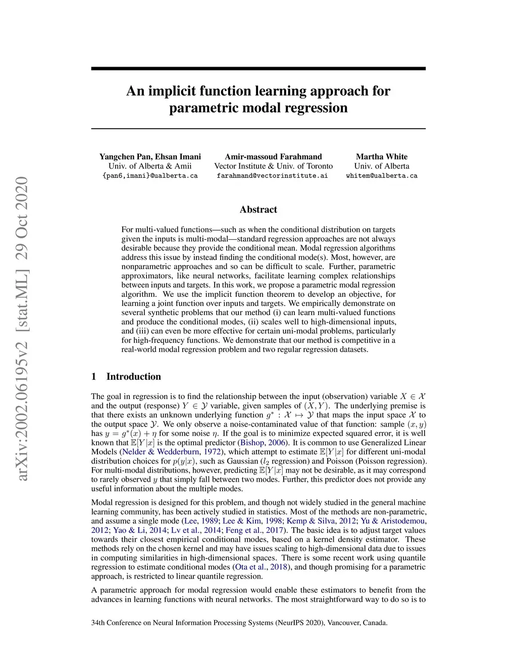 For multi-valued functions---such as when the conditional distribution on targets given the inputs is multi-modal---standard regression approaches are not always desirable because they provide the conditional mean. Modal regression algorithms address this issue by instead finding the conditional mode(s). Most, however, are nonparametric approaches and so can be difficult to scale. Further, parametric approximators, like neural networks, facilitate learning complex relationships between inputs and targets. In this work, we propose a parametric modal regression algorithm. We use the implicit function theorem to develop an objective, for learning a joint function over inputs and targets. We empirically demonstrate on several synthetic problems that our method (i) can learn multi-valued functions and produce the conditional modes, (ii) scales well to high-dimensional inputs, and (iii) can even be more effective for certain uni-modal problems, particularly for high-frequency functions. We demonstrate that our method is competitive in a real-world modal regression problem and two regular regression datasets.