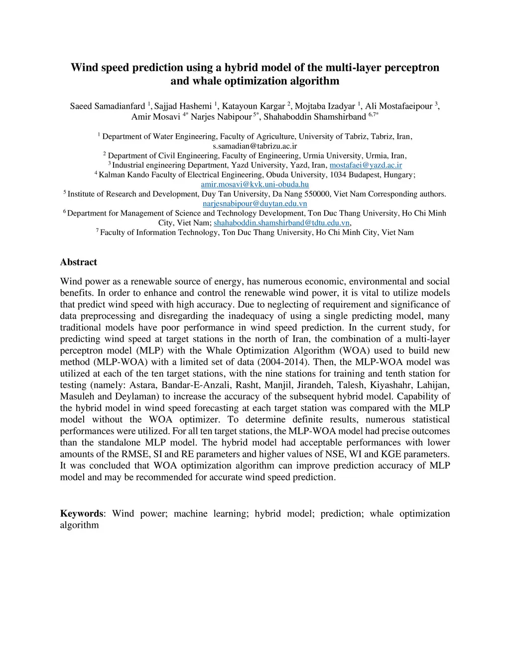 Wind speed prediction using a hybrid model of the multi-layer perceptron