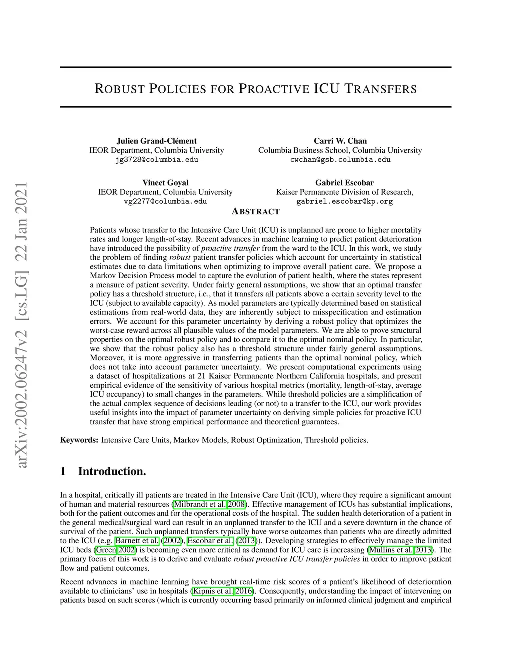 Patients whose transfer to the Intensive Care Unit (ICU) is unplanned are prone to higher mortality rates than those who were admitted directly to the ICU. Recent advances in machine learning to predict patient deterioration have introduced the possibility of \emph{proactive transfer} from the ward to the ICU. In this work, we study the problem of finding \emph{robust} patient transfer policies which account for uncertainty in statistical estimates due to data limitations when optimizing to improve overall patient care. We propose a Markov Decision Process model to capture the evolution of patient health, where the states represent a measure of patient severity. Under fairly general assumptions, we show that an optimal transfer policy has a threshold structure, i.e., that it transfers all patients above a certain severity level to the ICU (subject to available capacity). As model parameters are typically determined based on statistical estimations from real-world data, they are inherently subject to misspecification and estimation errors. We account for this parameter uncertainty by deriving a robust policy that optimizes the worst-case reward across all plausible values of the model parameters. We show that the robust policy also has a threshold structure under fairly general assumptions. Moreover, it is more aggressive in transferring patients than the optimal nominal policy, which does not take into account parameter uncertainty. We present computational experiments using a dataset of hospitalizations at 21 KNPC hospitals, and present empirical evidence of the sensitivity of various hospital metrics (mortality, length-of-stay, average ICU occupancy) to small changes in the parameters. Our work provides useful insights into the impact of parameter uncertainty on deriving simple policies for proactive ICU transfer that have strong empirical performance and theoretical guarantees.