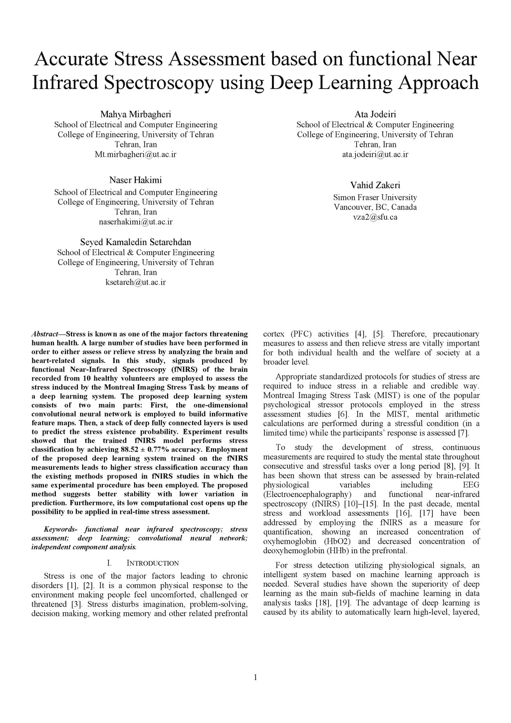 Stress is known as one of the major factors threatening human health. A large number of studies have been performed in order to either assess or relieve stress by analyzing the brain and heart-related signals. In this study, signals produced by functional Near-Infrared Spectroscopy (fNIRS) of the brain recorded from 10 healthy volunteers are employed to assess the stress induced by the Montreal Imaging Stress Task by means of a deep learning system. The proposed deep learning system consists of two main parts: First, the one-dimensional convolutional neural network is employed to build informative feature maps. Then, a stack of deep fully connected layers is used to predict the stress existence probability. Experiment results showed that the trained fNIRS model performs stress classification by achieving 88.52 -+ 0.77% accuracy. Employment of the proposed deep learning system trained on the fNIRS measurements leads to higher stress classification accuracy than the existing methods proposed in fNIRS studies in which the same experimental procedure has been employed. The proposed method suggests better stability with lower variation in prediction. Furthermore, its low computational cost opens up the possibility to be applied in real-time stress assessment.