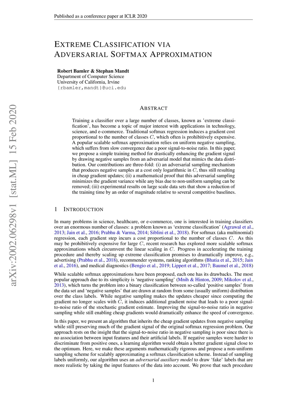 Training a classifier over a large number of classes, known as éxtreme classification', has become a topic of major interest with applications in technology, science, and e-commerce. Traditional softmax regression induces a gradient cost proportional to the number of classes , which often is prohibitively expensive. A popular scalable softmax approximation relies on uniform negative sampling, which suffers from slow convergence due a poor signal-to-noise ratio. In this paper, we propose a simple training method for drastically enhancing the gradient signal by drawing negative samples from an adversarial model that mimics the data distribution. Our contributions are three-fold: (i) an adversarial sampling mechanism that produces negative samples at a cost only logarithmic in , thus still resulting in cheap gradient updates; (ii) a mathematical proof that this adversarial sampling minimizes the gradient variance while any bias due to non-uniform sampling can be removed; (iii) experimental results on large scale data sets that show a reduction of the training time by an order of magnitude relative to several competitive baselines.