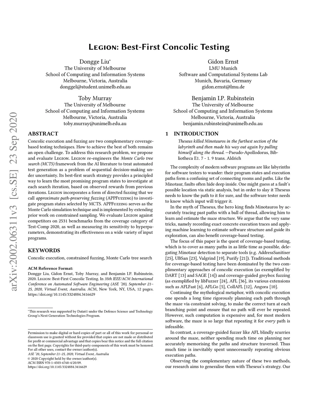 Concolic execution and fuzzing are two complementary coverage-based testing techniques. How to achieve the best of both remains an open challenge. To address this research problem, we propose and evaluate Legion. Legion re-engineers the Monte Carlo tree search (MCTS) framework from the AI literature to treat automated test generation as a problem of sequential decision-making under uncertainty. Its best-first search strategy provides a principled way to learn the most promising program states to investigate at each search iteration, based on observed rewards from previous iterations. Legion incorporates a form of directed fuzzing that we call approximate path-preserving fuzzing (APPFuzzing) to investigate program states selected by MCTS. APPFuzzing serves as the Monte Carlo simulation technique and is implemented by extending prior work on constrained sampling. We evaluate Legion against competitors on 2531 benchmarks from the coverage category of Test-Comp 2020, as well as measuring its sensitivity to hyperparameters, demonstrating its effectiveness on a wide variety of input programs.