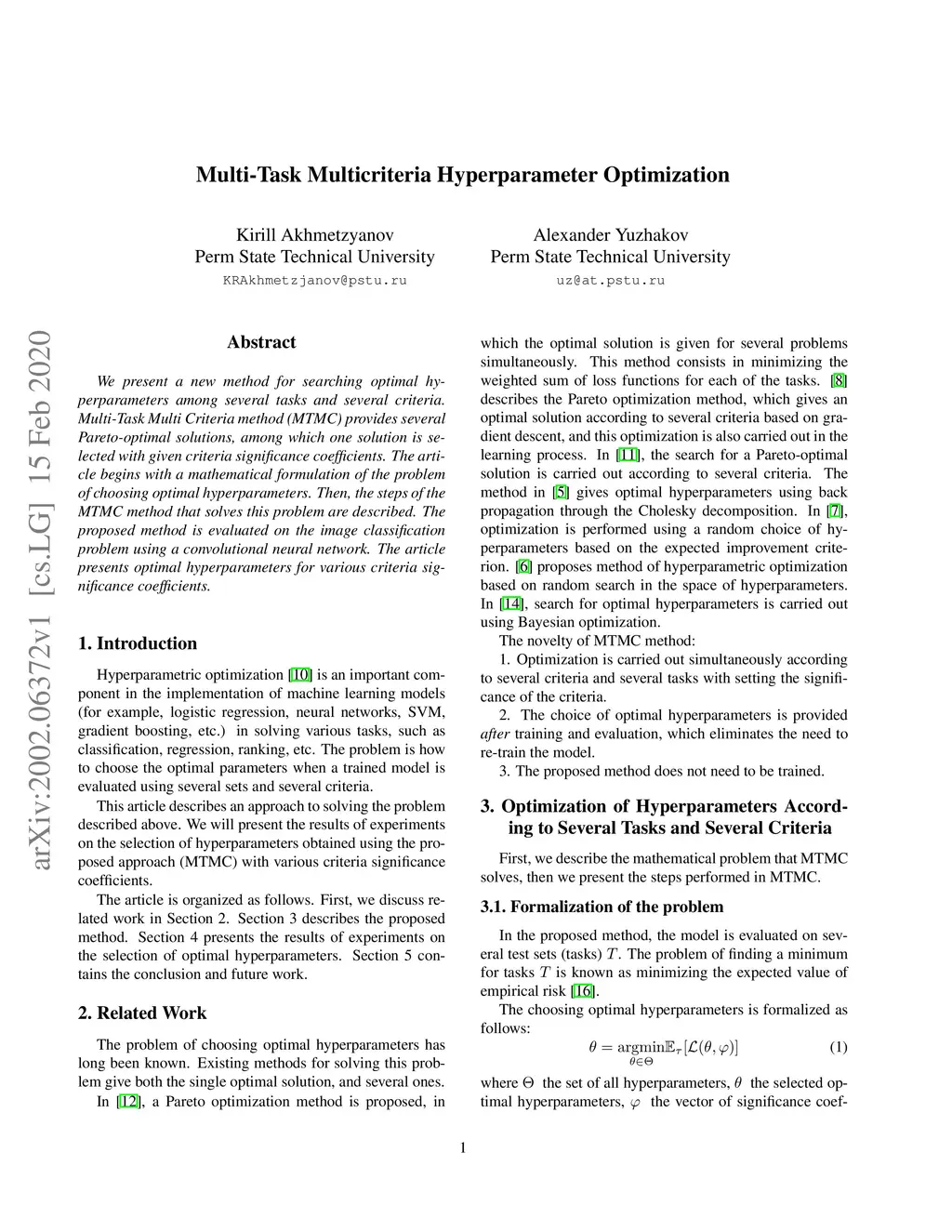 We present a new method for searching optimal hyperparameters among several tasks and several criteria. Multi-Task Multi Criteria method (MTMC) provides several Pareto-optimal solutions, among which one solution is selected with given criteria significance coefficients. The article begins with a mathematical formulation of the problem of choosing optimal hyperparameters. Then, the steps of the MTMC method that solves this problem are described. The proposed method is evaluated on the image classification problem using a convolutional neural network. The article presents optimal hyperparameters for various criteria significance coefficients.