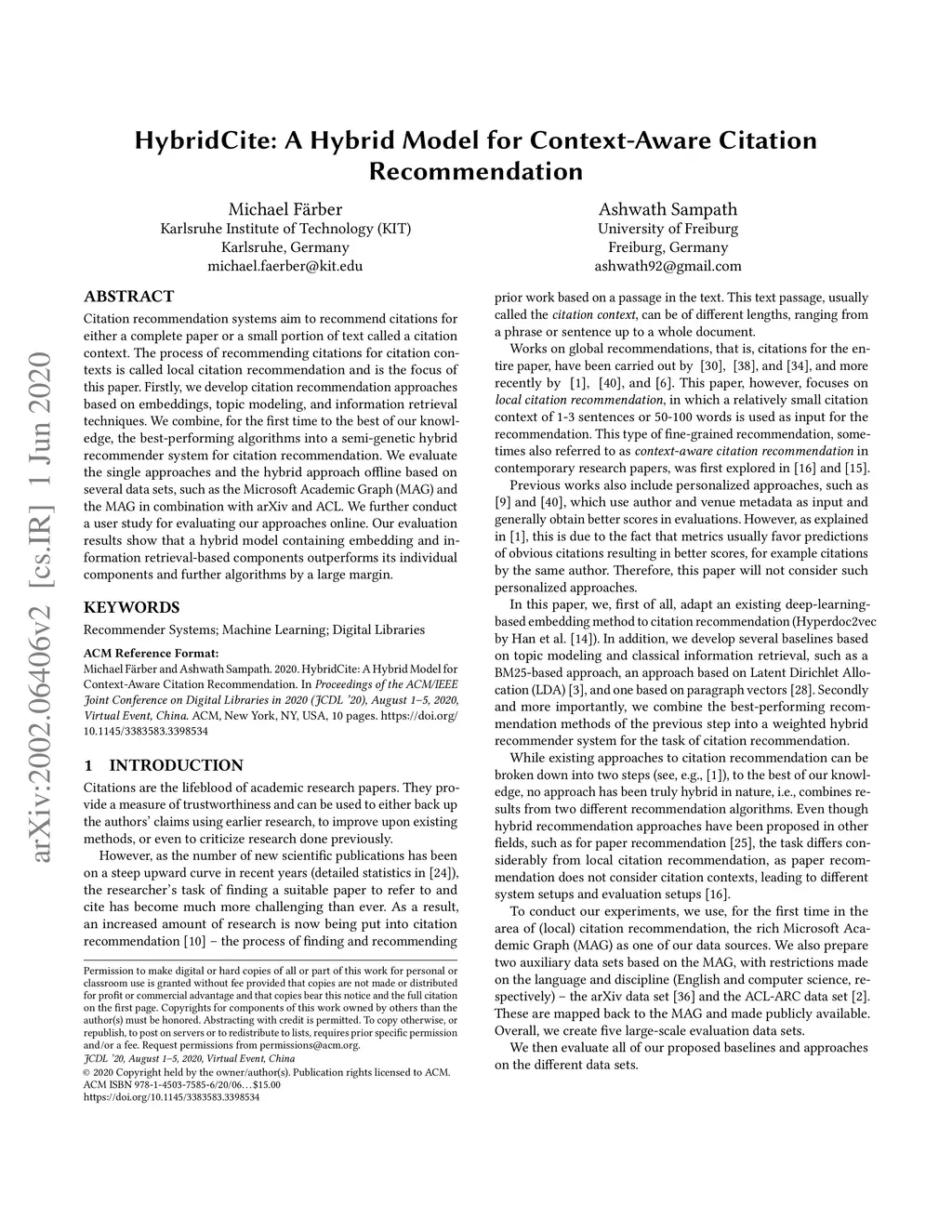 HybridCite: A Hybrid Model for Context-Aware Citation Recommendation
