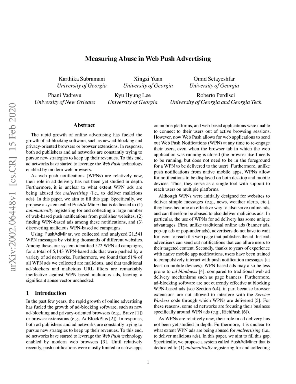 The rapid growth of online advertising has fueled the growth of ad-blocking software, such as new ad-blocking and privacy-oriented browsers or browser extensions. In response, both ad publishers and ad networks are constantly trying to pursue new strategies to keep up their revenues. To this end, ad networks have started to leverage the Web Push technology enabled by modern web browsers. As web push notifications (WPNs) are relatively new, their role in ad delivery has not been yet studied in depth. Furthermore, it is unclear to what extent WPN ads are being abused for malvertising (i.e., to deliver malicious ads). In this paper, we aim to fill this gap. Specifically, we propose a system called PushAdMiner that is dedicated to (1) automatically registering for and collecting a large number of web-based push notifications from publisher websites, (2) finding WPN-based ads among these notifications, and (3) discovering malicious WPN-based ad campaigns. Using PushAdMiner, we collected and analyzed 21,541 WPN messages by visiting thousands of different websites. Among these, our system identified 572 WPN ad campaigns, for a total of 5,143 WPN-based ads that were pushed by a variety of ad networks. Furthermore, we found that 51% of all WPN ads we collected are malicious, and that traditional ad-blockers and malicious URL filters are remarkably ineffective against WPN-based malicious ads, leaving a significant abuse vector unchecked.