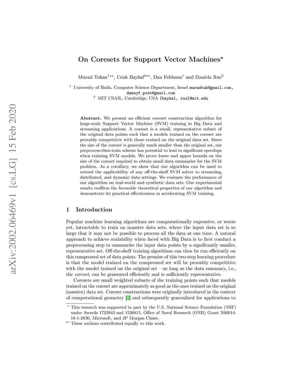 We present an efficient coreset construction algorithm for large-scale Support Vector Machine (SVM) training in Big Data and streaming applications. A coreset is a small, representative subset of the original data points such that a models trained on the coreset are provably competitive with those trained on the original data set. Since the size of the coreset is generally much smaller than the original set, our preprocess-then-train scheme has potential to lead to significant speedups when training SVM models. We prove lower and upper bounds on the size of the coreset required to obtain small data summaries for the SVM problem. As a corollary, we show that our algorithm can be used to extend the applicability of any off-the-shelf SVM solver to streaming, distributed, and dynamic data settings. We evaluate the performance of our algorithm on real-world and synthetic data sets. Our experimental results reaffirm the favorable theoretical properties of our algorithm and demonstrate its practical effectiveness in accelerating SVM training.