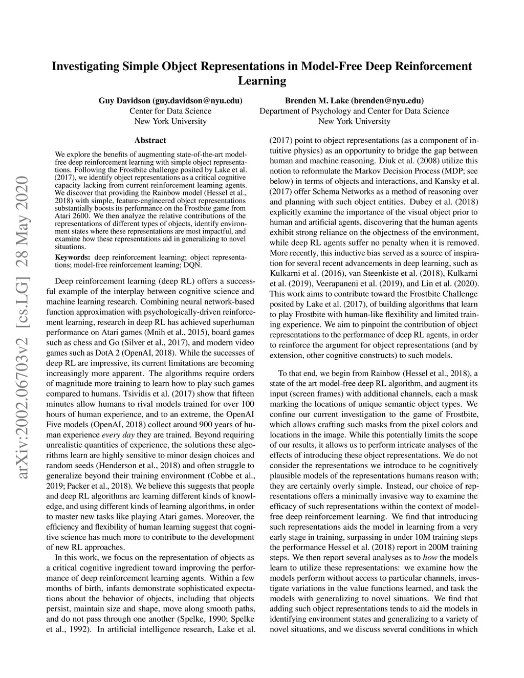 We explore the benefits of augmenting state-of-the-art model-free deep reinforcement algorithms with simple object representations. Following the Frostbite challenge posited by Lake et al. (2017), we identify object representations as a critical cognitive capacity lacking from current reinforcement learning agents. We discover that providing the Rainbow model (Hessel et al.,2018) with simple, feature-engineered object representations substantially boosts its performance on the Frostbite game from Atari 2600. We then analyze the relative contributions of the representations of different types of objects, identify environment states where these representations are most impactful, and examine how these representations aid in generalizing to novel situations.
