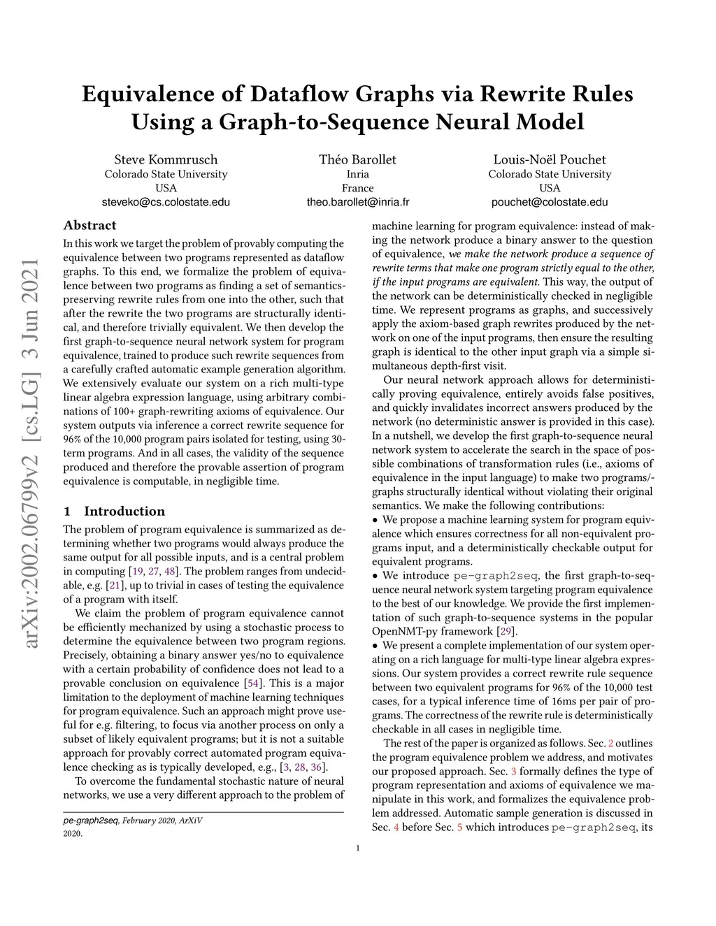 In this work we target the problem of provably computing the equivalence between two programs represented as dataflow graphs. To this end, we formalize the problem of equivalence between two programs as finding a set of semantics-preserving rewrite rules from one into the other, such that after the rewrite the two programs are structurally identical, and therefore trivially equivalent. We then develop the first graph-to-sequence neural network system for program equivalence, trained to produce such rewrite sequences from a carefully crafted automatic example generation algorithm. We extensively evaluate our system on a rich multi-type linear algebra expression language, using arbitrary combinations of 100+ graph-rewriting axioms of equivalence. Our system outputs via inference a correct rewrite sequence for 96% of the 10,000 program pairs isolated for testing, using 30-term programs. And in all cases, the validity of the sequence produced and therefore the provable assertion of program equivalence is computable, in negligible time.