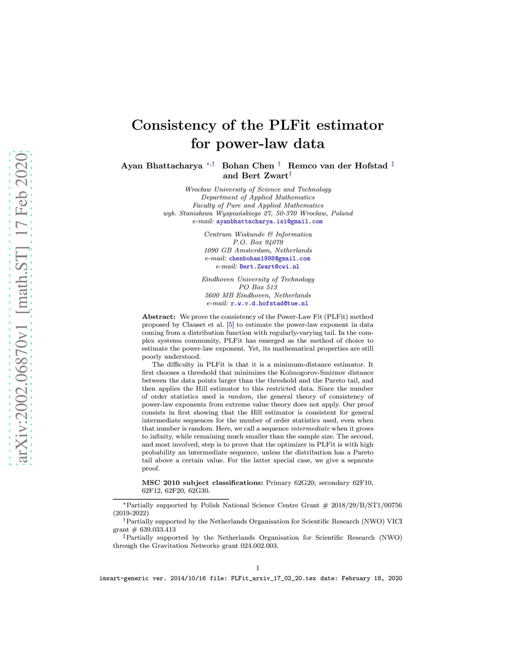 We prove the consistency of the Power-Law Fit PLFit method proposed by Clauset et al.(2009) to estimate the power-law exponent in data coming from a distribution function with regularly-varying tail. In the complex systems community, PLFit has emerged as the method of choice to estimate the power-law exponent. Yet, its mathematical properties are still poorly understood. The difficulty in PLFit is that it is a minimum-distance estimator. It first chooses a threshold that minimizes the Kolmogorov-Smirnov distance between the data points larger than the threshold and the Pareto tail, and then applies the Hill estimator to this restricted data. Since the number of order statistics used is random, the general theory of consistency of power-law exponents from extreme value theory does not apply. Our proof consists in first showing that the Hill estimator is consistent for general intermediate sequences for the number of order statistics used, even when that number is random. Here, we call a sequence intermediate when it grows to infinity, while remaining much smaller than the sample size. The second, and most involved, step is to prove that the optimizer in PLFit is with high probability an intermediate sequence, unless the distribution has a Pareto tail above a certain value. For the latter special case, we give a separate proof.