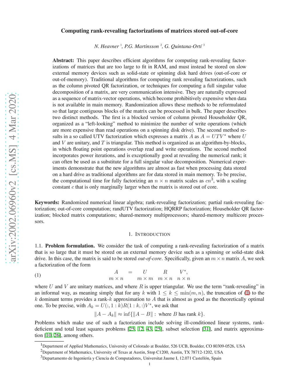 This paper describes efficient algorithms for computing rank-revealing factorizations of matrices that are too large to fit in RAM, and must instead be stored on slow external memory devices such as solid-state or spinning disk hard drives (out-of-core or out-of-memory). Traditional algorithms for computing rank revealing factorizations, such as the column pivoted QR factorization, or techniques for computing a full singular value decomposition of a matrix, are very communication intensive. They are naturally expressed as a sequence of matrix-vector operations, which become prohibitively expensive when data is not available in main memory. Randomization allows these methods to be reformulated so that large contiguous blocks of the matrix can be processed in bulk. The paper describes two distinct methods. The first is a blocked version of column pivoted Householder QR, organized as a "left-looking" method to minimize the number of write operations (which are more expensive than read operations on a spinning disk drive). The second method results in a so called UTV factorization which expresses a matrix as where and are unitary, and is triangular. This method is organized as an algorithm-by-blocks, in which floating point operations overlap read and write operations. The second method incorporates power iterations, and is exceptionally good at revealing the numerical rank; it can often be used as a substitute for a full singular value decomposition. Numerical experiments demonstrate that the new algorithms are almost as fast when processing data stored on a hard drive as traditional algorithms are for data stored in main memory. To be precise, the computational time for fully factorizing an matrix scales as , with a scaling constant that is only marginally larger when the matrix is stored out of core.