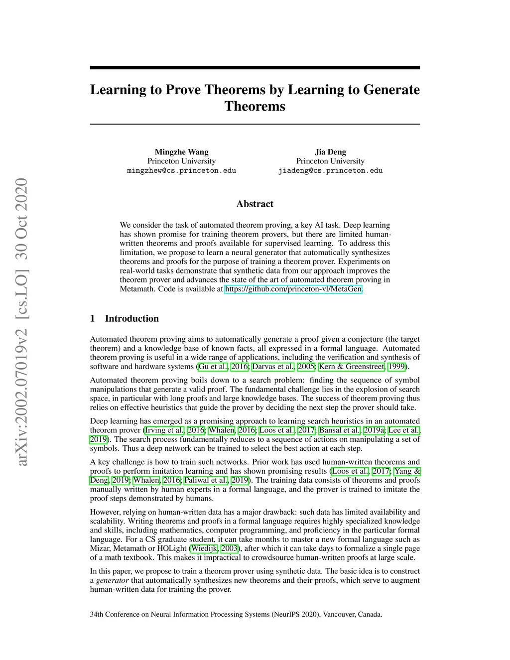 We consider the task of automated theorem proving, a key AI task. Deep learning has shown promise for training theorem provers, but there are limited human-written theorems and proofs available for supervised learning. To address this limitation, we propose to learn a neural generator that automatically synthesizes theorems and proofs for the purpose of training a theorem prover. Experiments on real-world tasks demonstrate that synthetic data from our approach improves the theorem prover and advances the state of the art of automated theorem proving in Metamath. Code is available at https://github.com/princeton-vl/MetaGen.