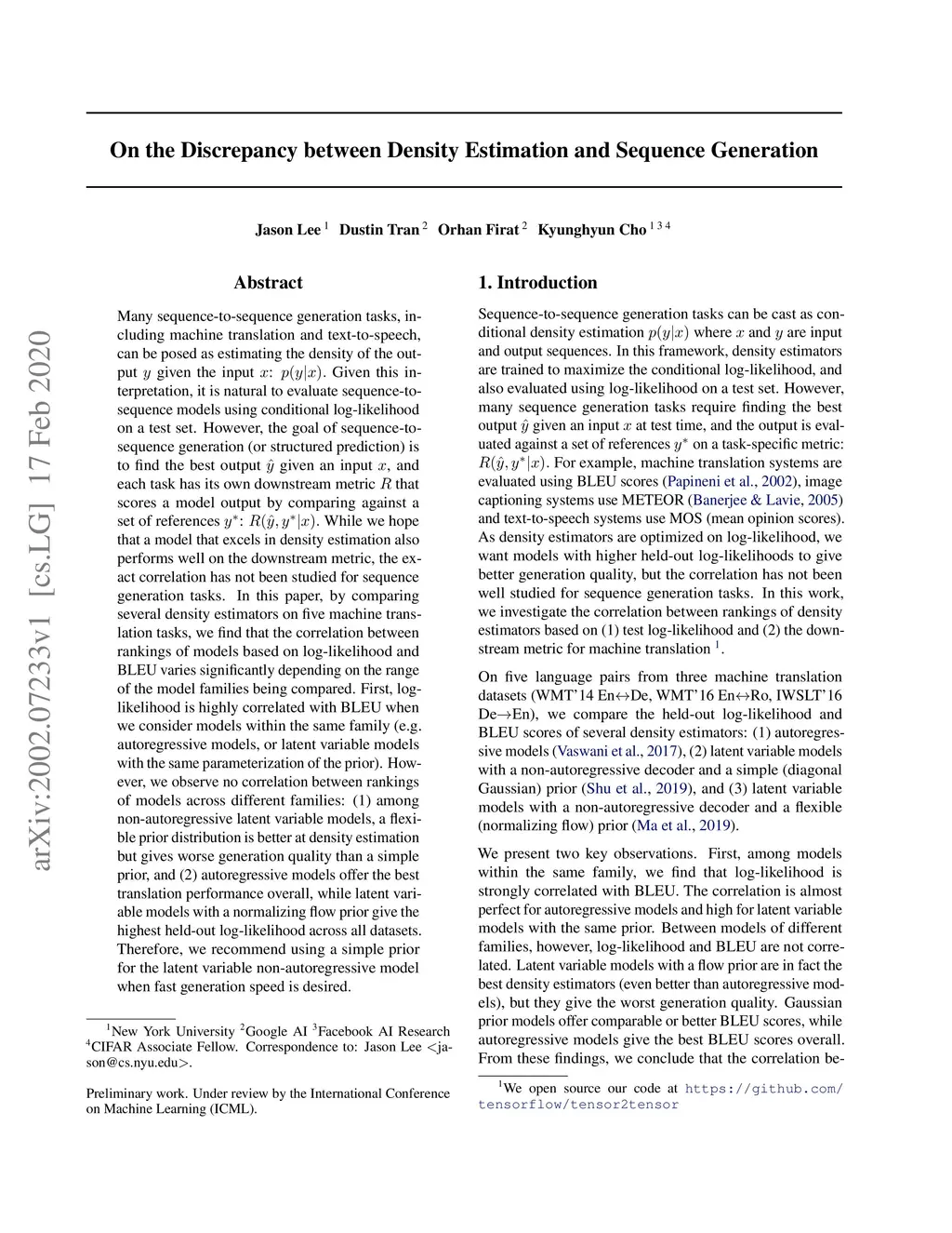 Many sequence-to-sequence generation tasks, including machine translation and text-to-speech, can be posed as estimating the density of the output y given the input x: p(y|x). Given this interpretation, it is natural to evaluate sequence-to-sequence models using conditional log-likelihood on a test set. However, the goal of sequence-to-sequence generation (or structured prediction) is to find the best output y^ given an input x, and each task has its own downstream metric R that scores a model output by comparing against a set of references y*: R(y^, y* | x). While we hope that a model that excels in density estimation also performs well on the downstream metric, the exact correlation has not been studied for sequence generation tasks. In this paper, by comparing several density estimators on five machine translation tasks, we find that the correlation between rankings of models based on log-likelihood and BLEU varies significantly depending on the range of the model families being compared. First, log-likelihood is highly correlated with BLEU when we consider models within the same family (e.g. autoregressive models, or latent variable models with the same parameterization of the prior). However, we observe no correlation between rankings of models across different families: (1) among non-autoregressive latent variable models, a flexible prior distribution is better at density estimation but gives worse generation quality than a simple prior, and (2) autoregressive models offer the best translation performance overall, while latent variable models with a normalizing flow prior give the highest held-out log-likelihood across all datasets. Therefore, we recommend using a simple prior for the latent variable non-autoregressive model when fast generation speed is desired.