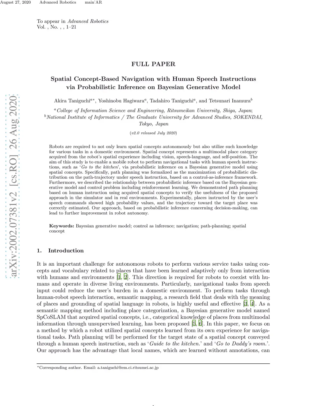 Robots are required to not only learn spatial concepts autonomously but also utilize such knowledge for various tasks in a domestic environment. Spatial concept represents a multimodal place category acquired from the robot's spatial experience including vision, speech-language, and self-position. The aim of this study is to enable a mobile robot to perform navigational tasks with human speech instructions, such as `Go to the kitchen', via probabilistic inference on a Bayesian generative model using spatial concepts. Specifically, path planning was formalized as the maximization of probabilistic distribution on the path-trajectory under speech instruction, based on a control-as-inference framework. Furthermore, we described the relationship between probabilistic inference based on the Bayesian generative model and control problem including reinforcement learning. We demonstrated path planning based on human instruction using acquired spatial concepts to verify the usefulness of the proposed approach in the simulator and in real environments. Experimentally, places instructed by the user's speech commands showed high probability values, and the trajectory toward the target place was correctly estimated. Our approach, based on probabilistic inference concerning decision-making, can lead to further improvement in robot autonomy.