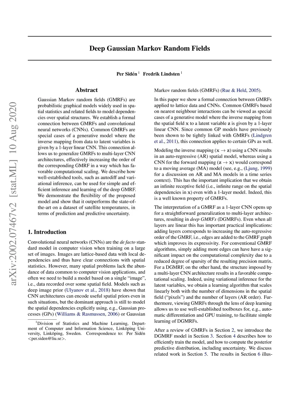 Gaussian Markov random fields (GMRFs) are probabilistic graphical models widely used in spatial statistics and related fields to model dependencies over spatial structures. We establish a formal connection between GMRFs and convolutional neural networks (CNNs). Common GMRFs are special cases of a generative model where the inverse mapping from data to latent variables is given by a 1-layer linear CNN. This connection allows us to generalize GMRFs to multi-layer CNN architectures, effectively increasing the order of the corresponding GMRF in a way which has favorable computational scaling. We describe how well-established tools, such as autodiff and variational inference, can be used for simple and efficient inference and learning of the deep GMRF. We demonstrate the flexibility of the proposed model and show that it outperforms the state-of-the-art on a dataset of satellite temperatures, in terms of prediction and predictive uncertainty.