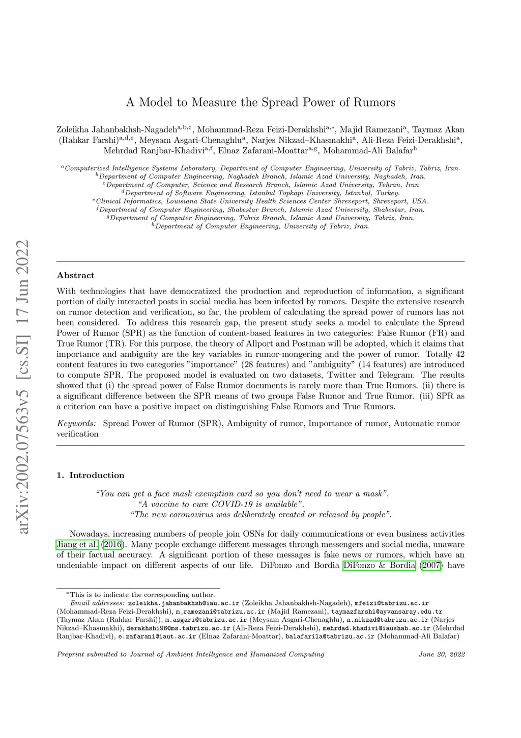 With technologies that have democratized the production and reproduction of information, a significant portion of daily interacted posts in social media has been infected by rumors. Despite the extensive research on rumor detection and verification, so far, the problem of calculating the spread power of rumors has not been considered. To address this research gap, the present study seeks a model to calculate the Spread Power of Rumor (SPR) as the function of content-based features in two categories: False Rumor (FR) and True Rumor (TR). For this purpose, the theory of Allport and Postman will be adopted, which it claims that importance and ambiguity are the key variables in rumor-mongering and the power of rumor. Totally 42 content features in two categories "importance" (28 features) and "ambiguity" (14 features) are introduced to compute SPR. The proposed model is evaluated on two datasets, Twitter and Telegram. The results showed that (i) the spread power of False Rumor documents is rarely more than True Rumors. (ii) there is a significant difference between the SPR means of two groups False Rumor and True Rumor. (iii) SPR as a criterion can have a positive impact on distinguishing False Rumors and True Rumors.
