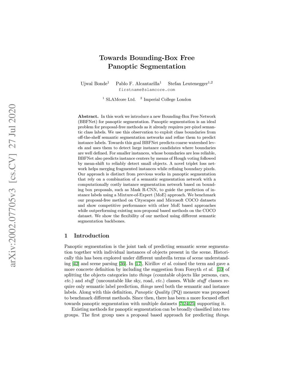 In this work we introduce a new Bounding-Box Free Network (BBFNet) for panoptic segmentation. Panoptic segmentation is an ideal problem for proposal-free methods as it already requires per-pixel semantic class labels. We use this observation to exploit class boundaries from off-the-shelf semantic segmentation networks and refine them to predict instance labels. Towards this goal BBFNet predicts coarse watershed levels and uses them to detect large instance candidates where boundaries are well defined. For smaller instances, whose boundaries are less reliable, BBFNet also predicts instance centers by means of Hough voting followed by mean-shift to reliably detect small objects. A novel triplet loss network helps merging fragmented instances while refining boundary pixels. Our approach is distinct from previous works in panoptic segmentation that rely on a combination of a semantic segmentation network with a computationally costly instance segmentation network based on bounding box proposals, such as Mask R-CNN, to guide the prediction of instance labels using a Mixture-of-Expert (MoE) approach. We benchmark our proposal-free method on Cityscapes and Microsoft COCO datasets and show competitive performance with other MoE based approaches while outperforming existing non-proposal based methods on the COCO dataset. We show the flexibility of our method using different semantic segmentation backbones.