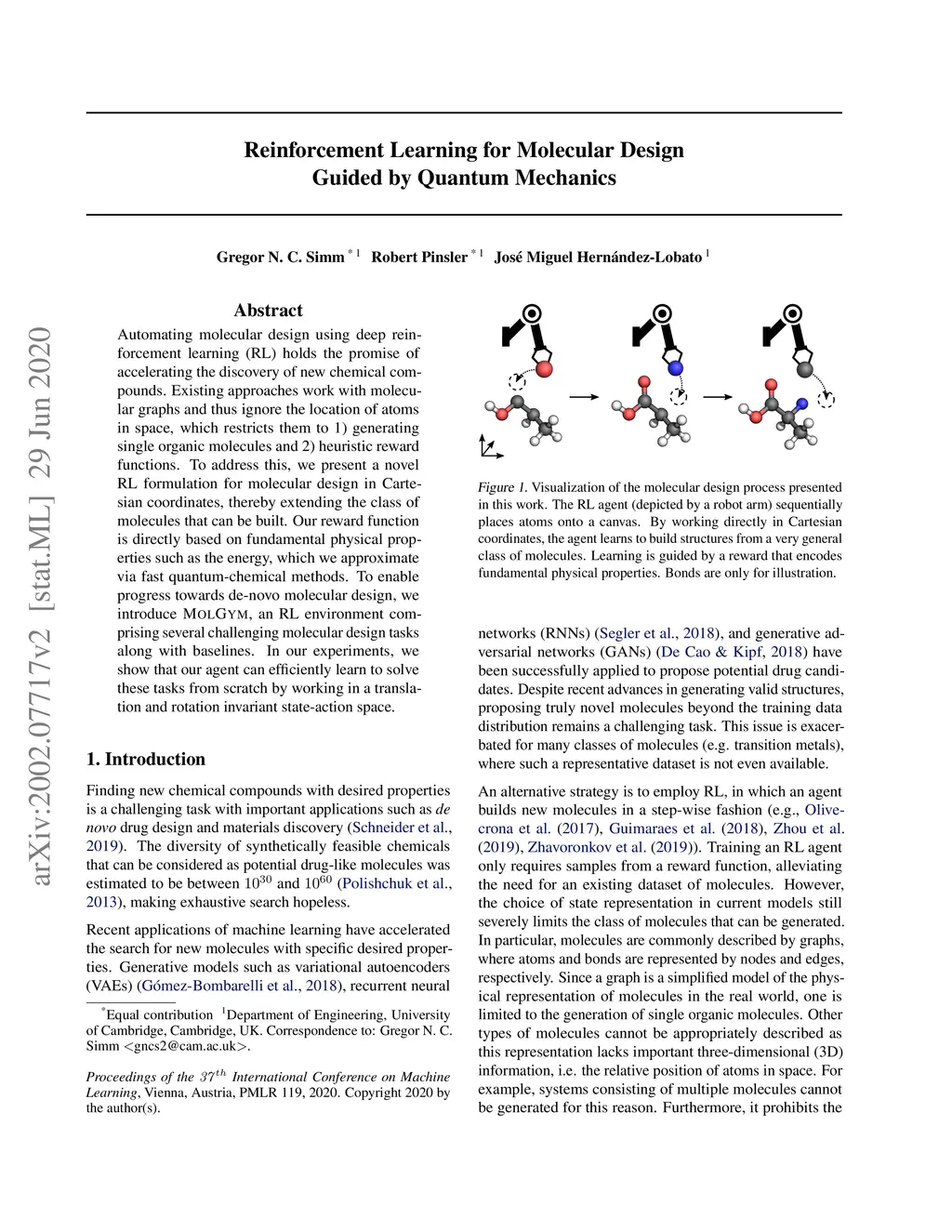 Automating molecular design using deep reinforcement learning (RL) holds the promise of accelerating the discovery of new chemical compounds. Existing approaches work with molecular graphs and thus ignore the location of atoms in space, which restricts them to 1) generating single organic molecules and 2) heuristic reward functions. To address this, we present a novel RL formulation for molecular design in Cartesian coordinates, thereby extending the class of molecules that can be built. Our reward function is directly based on fundamental physical properties such as the energy, which we approximate via fast quantum-chemical methods. To enable progress towards de-novo molecular design, we introduce MolGym, an RL environment comprising several challenging molecular design tasks along with baselines. In our experiments, we show that our agent can efficiently learn to solve these tasks from scratch by working in a translation and rotation invariant state-action space.