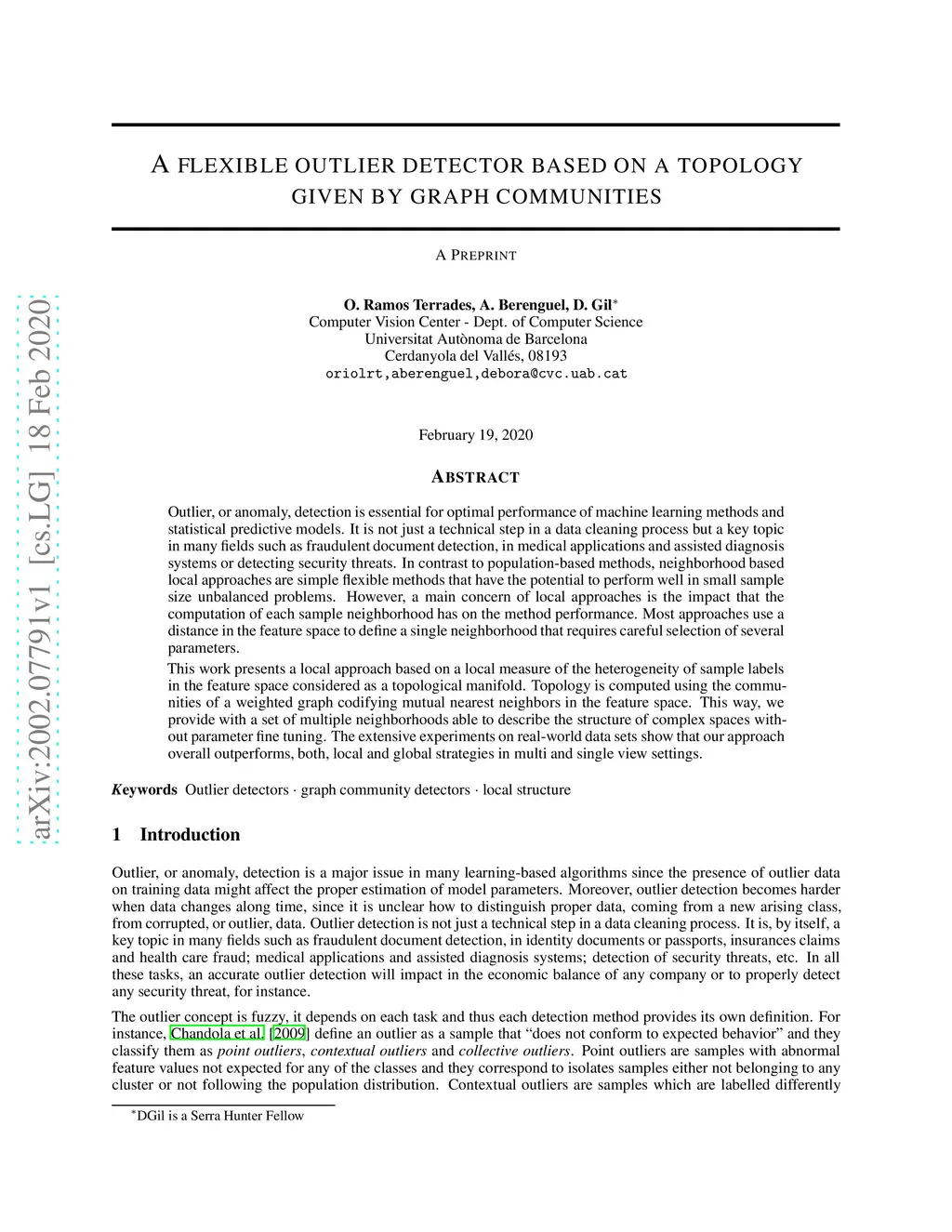 Outlier, or anomaly, detection is essential for optimal performance of machine learning methods and statistical predictive models. It is not just a technical step in a data cleaning process but a key topic in many fields such as fraudulent document detection, in medical applications and assisted diagnosis systems or detecting security threats. In contrast to population-based methods, neighborhood based local approaches are simple flexible methods that have the potential to perform well in small sample size unbalanced problems. However, a main concern of local approaches is the impact that the computation of each sample neighborhood has on the method performance. Most approaches use a distance in the feature space to define a single neighborhood that requires careful selection of several parameters. This work presents a local approach based on a local measure of the heterogeneity of sample labels in the feature space considered as a topological manifold. Topology is computed using the communities of a weighted graph codifying mutual nearest neighbors in the feature space. This way, we provide with a set of multiple neighborhoods able to describe the structure of complex spaces without parameter fine tuning. The extensive experiments on real-world data sets show that our approach overall outperforms, both, local and global strategies in multi and single view settings.