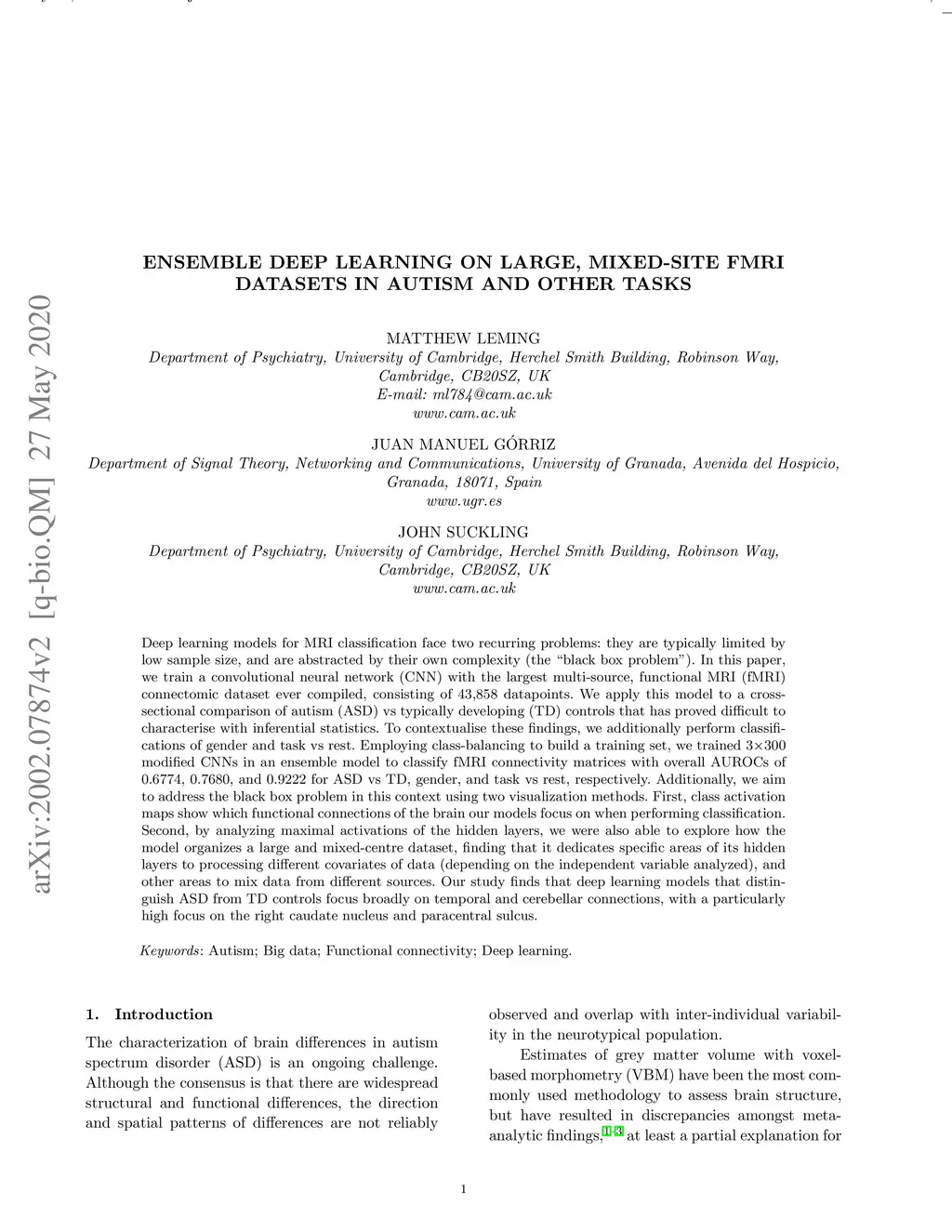 Deep learning models for MRI classification face two recurring problems: they are typically limited by low sample size, and are abstracted by their own complexity (the "black box problem"). In this paper, we train a convolutional neural network (CNN) with the largest multi-source, functional MRI (fMRI) connectomic dataset ever compiled, consisting of 43,858 datapoints. We apply this model to a cross-sectional comparison of autism (ASD) vs typically developing (TD) controls that has proved difficult to characterise with inferential statistics. To contextualise these findings, we additionally perform classifications of gender and task vs rest. Employing class-balancing to build a training set, we trained 3300 modified CNNs in an ensemble model to classify fMRI connectivity matrices with overall AUROCs of 0.6774, 0.7680, and 0.9222 for ASD vs TD, gender, and task vs rest, respectively. Additionally, we aim to address the black box problem in this context using two visualization methods. First, class activation maps show which functional connections of the brain our models focus on when performing classification. Second, by analyzing maximal activations of the hidden layers, we were also able to explore how the model organizes a large and mixed-centre dataset, finding that it dedicates specific areas of its hidden layers to processing different covariates of data (depending on the independent variable analyzed), and other areas to mix data from different sources. Our study finds that deep learning models that distinguish ASD from TD controls focus broadly on temporal and cerebellar connections, with a particularly high focus on the right caudate nucleus and paracentral sulcus.