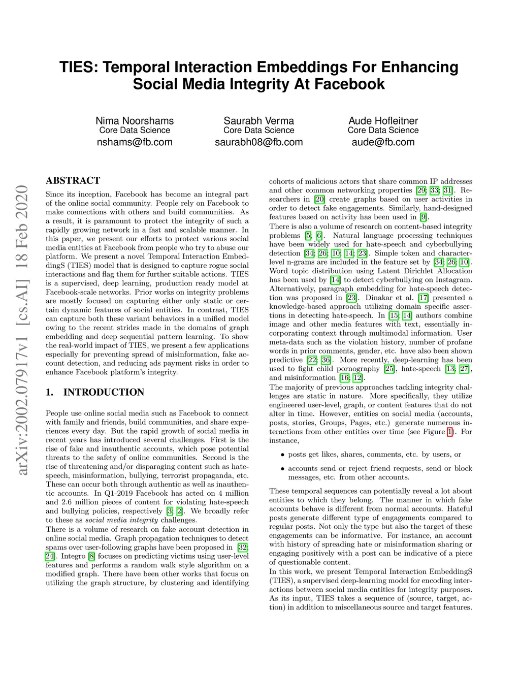 Since its inception, Facebook has become an integral part of the online social community. People rely on Facebook to make connections with others and build communities. As a result, it is paramount to protect the integrity of such a rapidly growing network in a fast and scalable manner. In this paper, we present our efforts to protect various social media entities at Facebook from people who try to abuse our platform. We present a novel Temporal Interaction EmbeddingS (TIES) model that is designed to capture rogue social interactions and flag them for further suitable actions. TIES is a supervised, deep learning, production ready model at Facebook-scale networks. Prior works on integrity problems are mostly focused on capturing either only static or certain dynamic features of social entities. In contrast, TIES can capture both these variant behaviors in a unified model owing to the recent strides made in the domains of graph embedding and deep sequential pattern learning. To show the real-world impact of TIES, we present a few applications especially for preventing spread of misinformation, fake account detection, and reducing ads payment risks in order to enhance the platform's integrity.