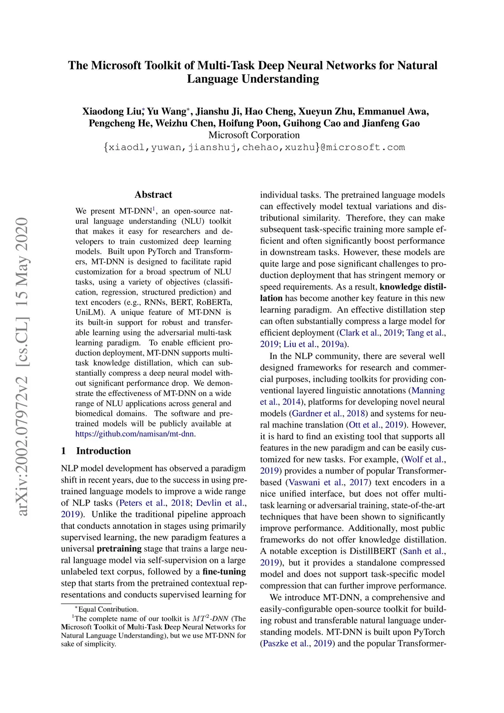 We present MT-DNN, an open-source natural language understanding (NLU) toolkit that makes it easy for researchers and developers to train customized deep learning models. Built upon PyTorch and Transformers, MT-DNN is designed to facilitate rapid customization for a broad spectrum of NLU tasks, using a variety of objectives (classification, regression, structured prediction) and text encoders (e.g., RNNs, BERT, RoBERTa, UniLM). A unique feature of MT-DNN is its built-in support for robust and transferable learning using the adversarial multi-task learning paradigm. To enable efficient production deployment, MT-DNN supports multi-task knowledge distillation, which can substantially compress a deep neural model without significant performance drop. We demonstrate the effectiveness of MT-DNN on a wide range of NLU applications across general and biomedical domains. The software and pre-trained models will be publicly available at https://github.com/namisan/mt-dnn.
