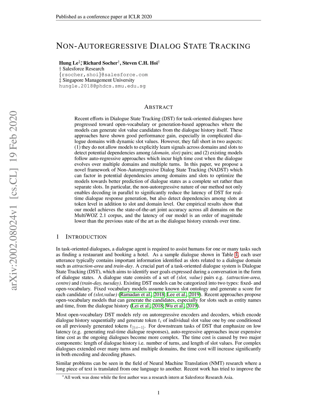 Recent efforts in Dialogue State Tracking (DST) for task-oriented dialogues have progressed toward open-vocabulary or generation-based approaches where the models can generate slot value candidates from the dialogue history itself. These approaches have shown good performance gain, especially in complicated dialogue domains with dynamic slot values. However, they fall short in two aspects: (1) they do not allow models to explicitly learn signals across domains and slots to detect potential dependencies among (domain, slot) pairs; and (2) existing models follow auto-regressive approaches which incur high time cost when the dialogue evolves over multiple domains and multiple turns. In this paper, we propose a novel framework of Non-Autoregressive Dialog State Tracking (NADST) which can factor in potential dependencies among domains and slots to optimize the models towards better prediction of dialogue states as a complete set rather than separate slots. In particular, the non-autoregressive nature of our method not only enables decoding in parallel to significantly reduce the latency of DST for real-time dialogue response generation, but also detect dependencies among slots at token level in addition to slot and domain level. Our empirical results show that our model achieves the state-of-the-art joint accuracy across all domains on the MultiWOZ 2.1 corpus, and the latency of our model is an order of magnitude lower than the previous state of the art as the dialogue history extends over time.