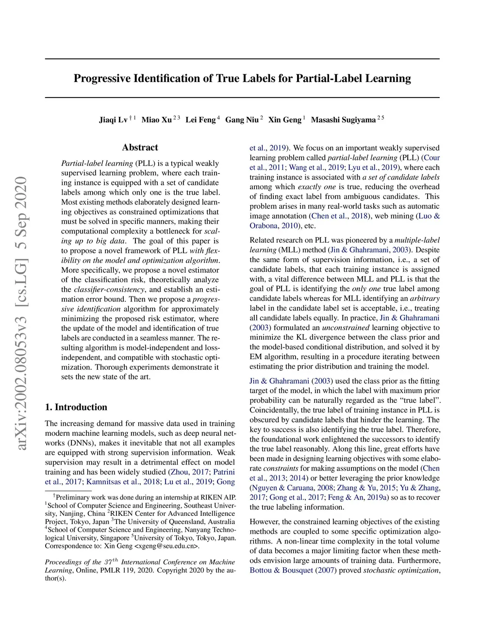 Partial-label learning (PLL) is a typical weakly supervised learning problem, where each training instance is equipped with a set of candidate labels among which only one is the true label. Most existing methods elaborately designed learning objectives as constrained optimizations that must be solved in specific manners, making their computational complexity a bottleneck for scaling up to big data. The goal of this paper is to propose a novel framework of PLL with flexibility on the model and optimization algorithm. More specifically, we propose a novel estimator of the classification risk, theoretically analyze the classifier-consistency, and establish an estimation error bound. Then we propose a progressive identification algorithm for approximately minimizing the proposed risk estimator, where the update of the model and identification of true labels are conducted in a seamless manner. The resulting algorithm is model-independent and loss-independent, and compatible with stochastic optimization. Thorough experiments demonstrate it sets the new state of the art.