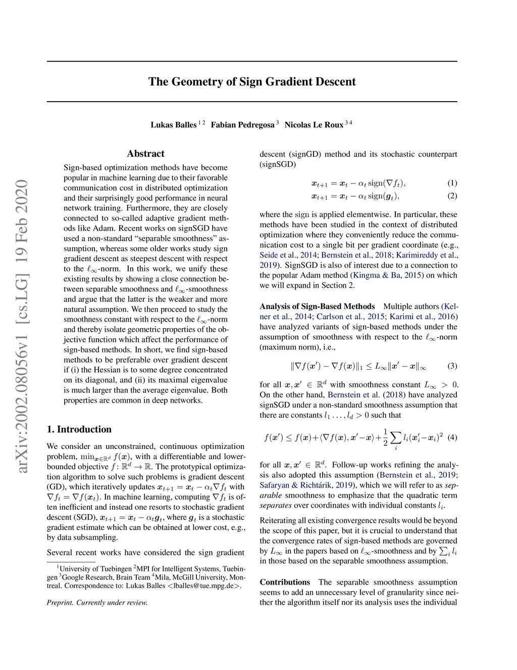 Sign-based optimization methods have become popular in machine learning due to their favorable communication cost in distributed optimization and their surprisingly good performance in neural network training. Furthermore, they are closely connected to so-called adaptive gradient methods like Adam. Recent works on signSGD have used a non-standard "separable smoothness" assumption, whereas some older works study sign gradient descent as steepest descent with respect to the -norm. In this work, we unify these existing results by showing a close connection between separable smoothness and -smoothness and argue that the latter is the weaker and more natural assumption. We then proceed to study the smoothness constant with respect to the -norm and thereby isolate geometric properties of the objective function which affect the performance of sign-based methods. In short, we find sign-based methods to be preferable over gradient descent if (i) the Hessian is to some degree concentrated on its diagonal, and (ii) its maximal eigenvalue is much larger than the average eigenvalue. Both properties are common in deep networks.