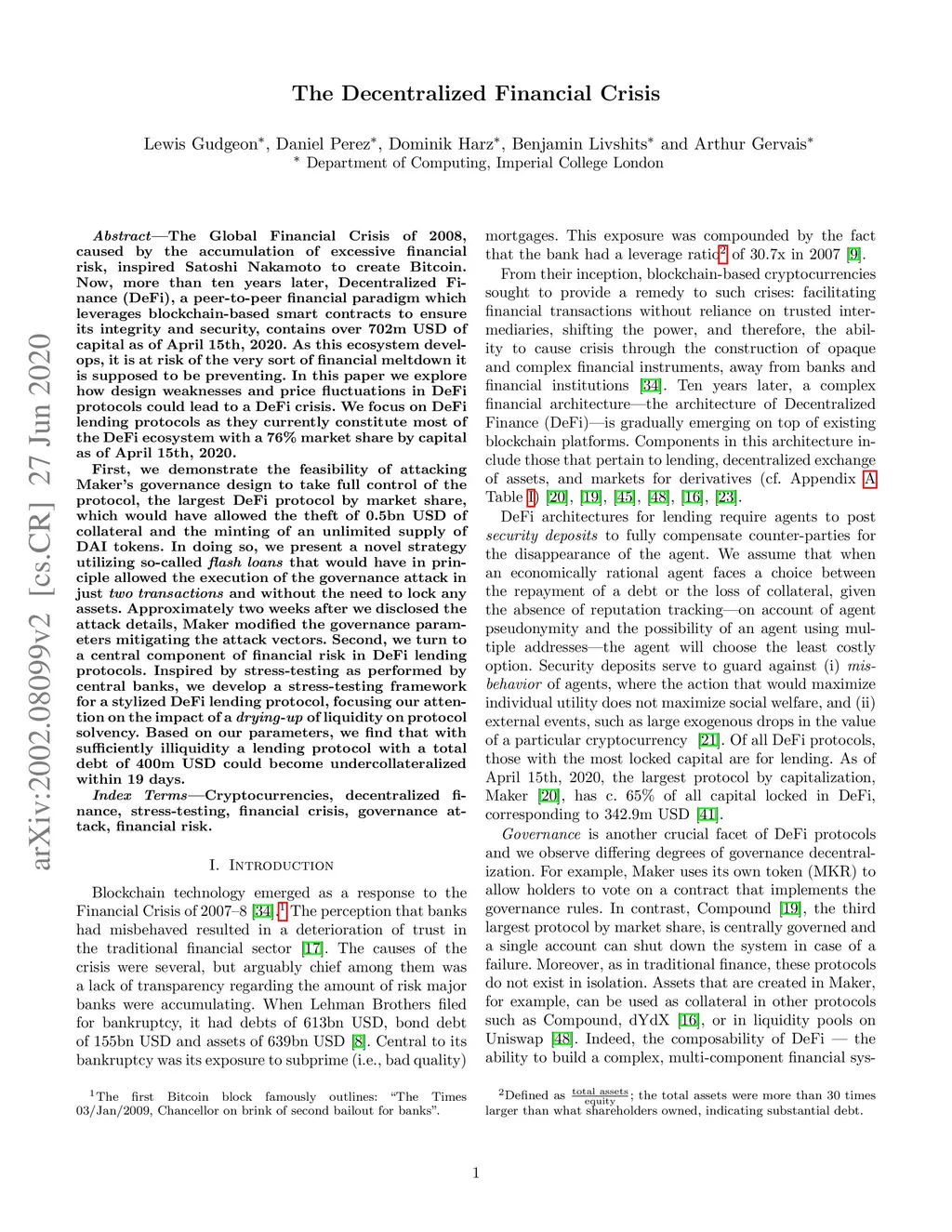 The Global Financial Crisis of 2008, caused by the accumulation of excessive financial risk, inspired Satoshi Nakamoto to create Bitcoin. Now, more than ten years later, Decentralized Finance (DeFi), a peer-to-peer financial paradigm which leverages blockchain-based smart contracts to ensure its integrity and security, contains over 702m USD of capital as of April 15th, 2020. As this ecosystem develops, it is at risk of the very sort of financial meltdown it is supposed to be preventing. In this paper we explore how design weaknesses and price fluctuations in DeFi protocols could lead to a DeFi crisis. We focus on DeFi lending protocols as they currently constitute most of the DeFi ecosystem with a 76% market share by capital as of April 15th, 2020. First, we demonstrate the feasibility of attacking Maker's governance design to take full control of the protocol, the largest DeFi protocol by market share, which would have allowed the theft of 0.5bn USD of collateral and the minting of an unlimited supply of DAI tokens. In doing so, we present a novel strategy utilizing so-called flash loans that would have in principle allowed the execution of the governance attack in just two transactions and without the need to lock any assets. Approximately two weeks after we disclosed the attack details, Maker modified the governance parameters mitigating the attack vectors. Second, we turn to a central component of financial risk in DeFi lending protocols. Inspired by stress-testing as performed by central banks, we develop a stress-testing framework for a stylized DeFi lending protocol, focusing our attention on the impact of a drying-up of liquidity on protocol solvency. Based on our parameters, we find that with sufficiently illiquidity a lending protocol with a total debt of 400m USD could become undercollateralized within 19 days.