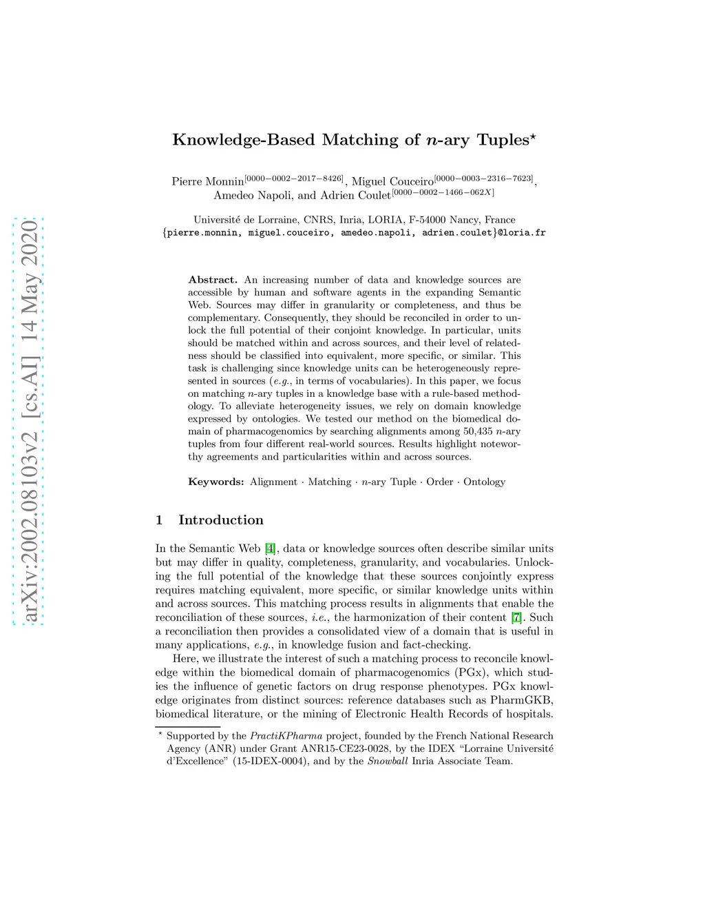 An increasing number of data and knowledge sources are accessible by human and software agents in the expanding Semantic Web. Sources may differ in granularity or completeness, and thus be complementary. Consequently, they should be reconciled in order to unlock the full potential of their conjoint knowledge. In particular, units should be matched within and across sources, and their level of relatedness should be classified into equivalent, more specific, or similar. This task is challenging since knowledge units can be heterogeneously represented in sources (e.g., in terms of vocabularies). In this paper, we focus on matching n-ary tuples in a knowledge base with a rule-based methodology. To alleviate heterogeneity issues, we rely on domain knowledge expressed by ontologies. We tested our method on the biomedical domain of pharmacogenomics by searching alignments among 50,435 n-ary tuples from four different real-world sources. Results highlight noteworthy agreements and particularities within and across sources.
