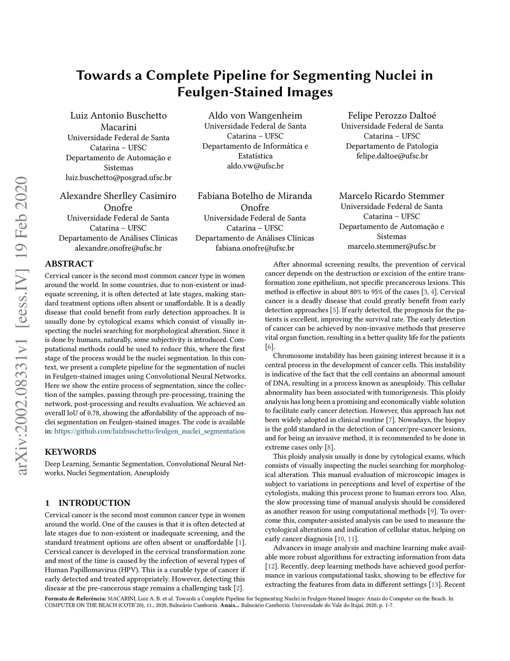 Cervical cancer is the second most common cancer type in women around the world. In some countries, due to non-existent or inadequate screening, it is often detected at late stages, making standard treatment options often absent or unaffordable. It is a deadly disease that could benefit from early detection approaches. It is usually done by cytological exams which consist of visually inspecting the nuclei searching for morphological alteration. Since it is done by humans, naturally, some subjectivity is introduced. Computational methods could be used to reduce this, where the first stage of the process would be the nuclei segmentation. In this context, we present a complete pipeline for the segmentation of nuclei in Feulgen-stained images using Convolutional Neural Networks. Here we show the entire process of segmentation, since the collection of the samples, passing through pre-processing, training the network, post-processing and results evaluation. We achieved an overall IoU of 0.78, showing the affordability of the approach of nuclei segmentation on Feulgen-stained images. The code is available in: https://github.com/luizbuschetto/feulgen_nuclei_segmentation.