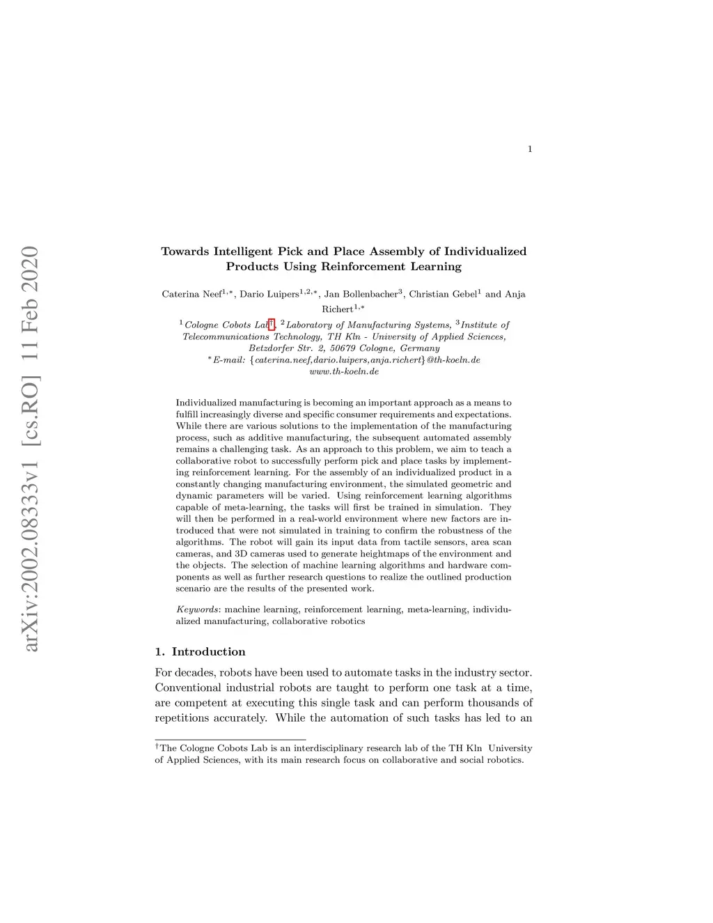 Individualized manufacturing is becoming an important approach as a means to fulfill increasingly diverse and specific consumer requirements and expectations. While there are various solutions to the implementation of the manufacturing process, such as additive manufacturing, the subsequent automated assembly remains a challenging task. As an approach to this problem, we aim to teach a collaborative robot to successfully perform pick and place tasks by implementing reinforcement learning. For the assembly of an individualized product in a constantly changing manufacturing environment, the simulated geometric and dynamic parameters will be varied. Using reinforcement learning algorithms capable of meta-learning, the tasks will first be trained in simulation. They will then be performed in a real-world environment where new factors are introduced that were not simulated in training to confirm the robustness of the algorithms. The robot will gain its input data from tactile sensors, area scan cameras, and 3D cameras used to generate heightmaps of the environment and the objects. The selection of machine learning algorithms and hardware components as well as further research questions to realize the outlined production scenario are the results of the presented work.