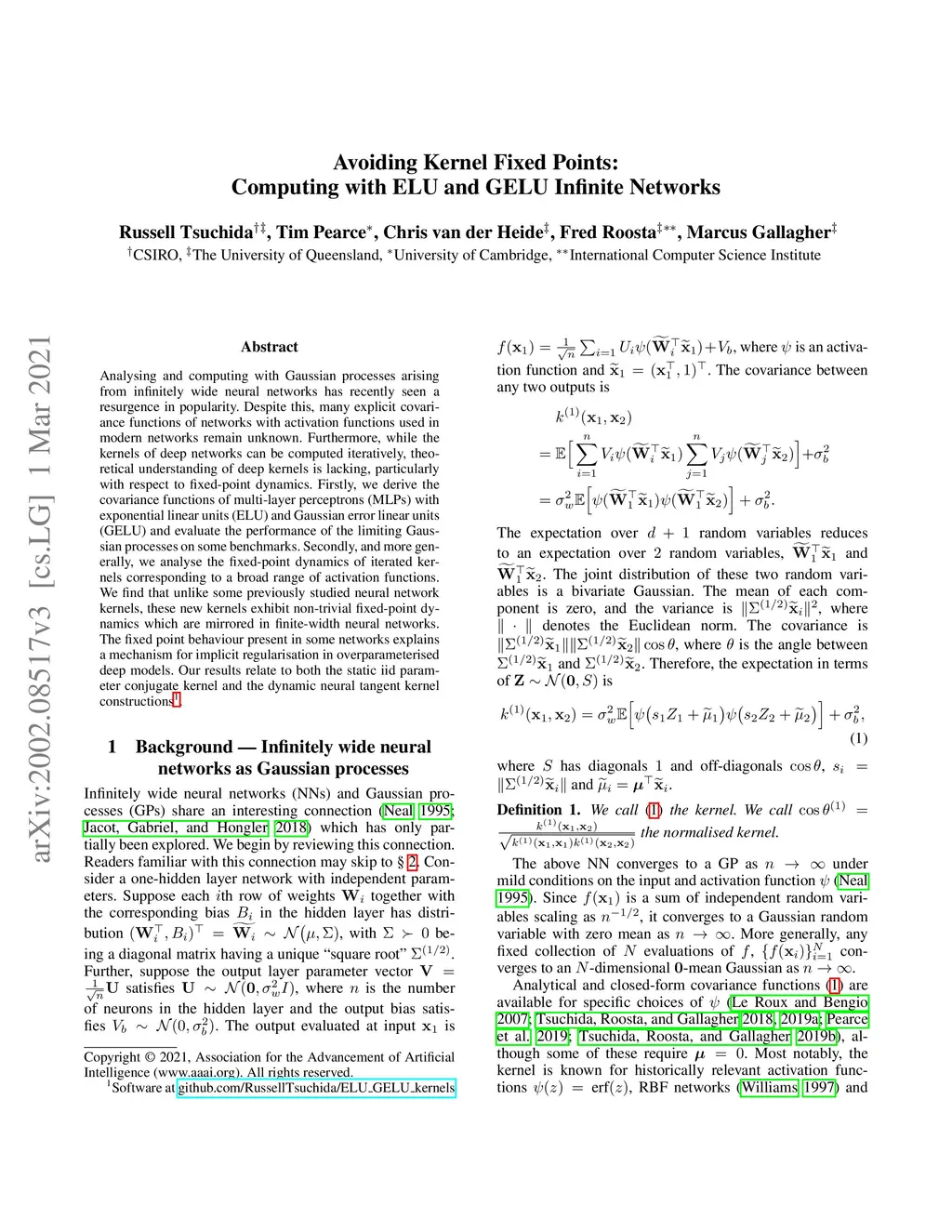 Analysing and computing with Gaussian processes arising from infinitely wide neural networks has recently seen a resurgence in popularity. Despite this, many explicit covariance functions of networks with activation functions used in modern networks remain unknown. Furthermore, while the kernels of deep networks can be computed iteratively, theoretical understanding of deep kernels is lacking, particularly with respect to fixed-point dynamics. Firstly, we derive the covariance functions of multi-layer perceptrons (MLPs) with exponential linear units (ELU) and Gaussian error linear units (GELU) and evaluate the performance of the limiting Gaussian processes on some benchmarks. Secondly, and more generally, we analyse the fixed-point dynamics of iterated kernels corresponding to a broad range of activation functions. We find that unlike some previously studied neural network kernels, these new kernels exhibit non-trivial fixed-point dynamics which are mirrored in finite-width neural networks. The fixed point behaviour present in some networks explains a mechanism for implicit regularisation in overparameterised deep models. Our results relate to both the static iid parameter conjugate kernel and the dynamic neural tangent kernel constructions. Software at github.com/RussellTsuchida/ELU_GELU_kernels.