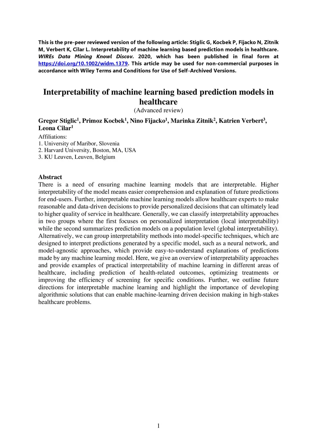 There is a need of ensuring machine learning models that are interpretable. Higher interpretability of the model means easier comprehension and explanation of future predictions for end-users. Further, interpretable machine learning models allow healthcare experts to make reasonable and data-driven decisions to provide personalized decisions that can ultimately lead to higher quality of service in healthcare. Generally, we can classify interpretability approaches in two groups where the first focuses on personalized interpretation (local interpretability) while the second summarizes prediction models on a population level (global interpretability). Alternatively, we can group interpretability methods into model-specific techniques, which are designed to interpret predictions generated by a specific model, such as a neural network, and model-agnostic approaches, which provide easy-to-understand explanations of predictions made by any machine learning model. Here, we give an overview of interpretability approaches and provide examples of practical interpretability of machine learning in different areas of healthcare, including prediction of health-related outcomes, optimizing treatments or improving the efficiency of screening for specific conditions. Further, we outline future directions for interpretable machine learning and highlight the importance of developing algorithmic solutions that can enable machine-learning driven decision making in high-stakes healthcare problems.
