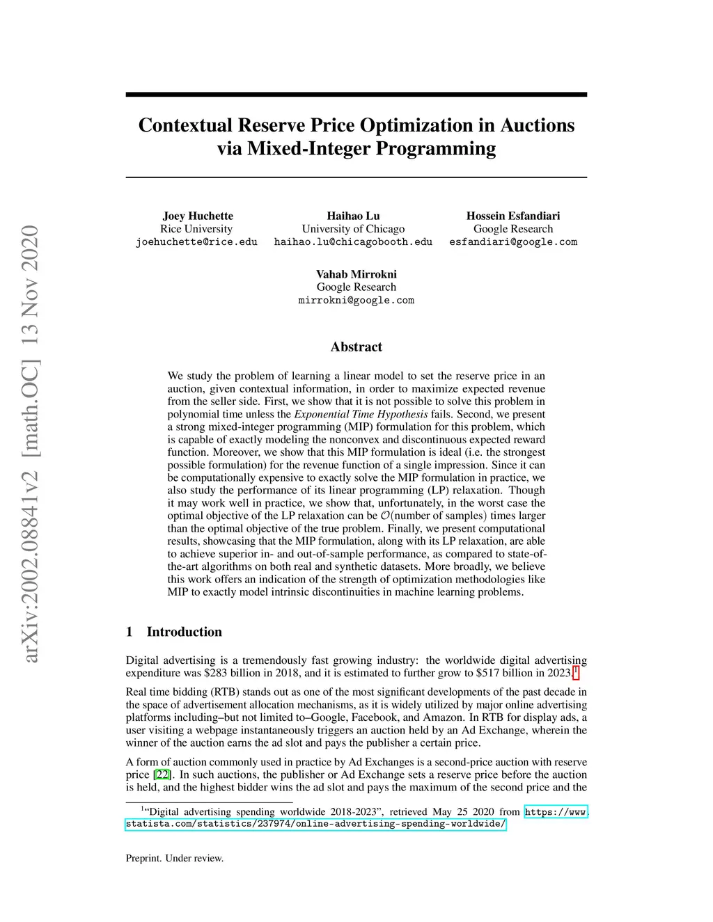 We study the problem of learning a linear model to set the reserve price in an auction, given contextual information, in order to maximize expected revenue from the seller side. First, we show that it is not possible to solve this problem in polynomial time unless the \emph{Exponential Time Hypothesis} fails. Second, we present a strong mixed-integer programming (MIP) formulation for this problem, which is capable of exactly modeling the nonconvex and discontinuous expected reward function. Moreover, we show that this MIP formulation is ideal (i.e. the strongest possible formulation) for the revenue function of a single impression. Since it can be computationally expensive to exactly solve the MIP formulation in practice, we also study the performance of its linear programming (LP) relaxation. Though it may work well in practice, we show that, unfortunately, in the worst case the optimal objective of the LP relaxation can be O(number of samples) times larger than the optimal objective of the true problem. Finally, we present computational results, showcasing that the MIP formulation, along with its LP relaxation, are able to achieve superior in- and out-of-sample performance, as compared to state-of-the-art algorithms on both real and synthetic datasets. More broadly, we believe this work offers an indication of the strength of optimization methodologies like MIP to exactly model intrinsic discontinuities in machine learning problems.