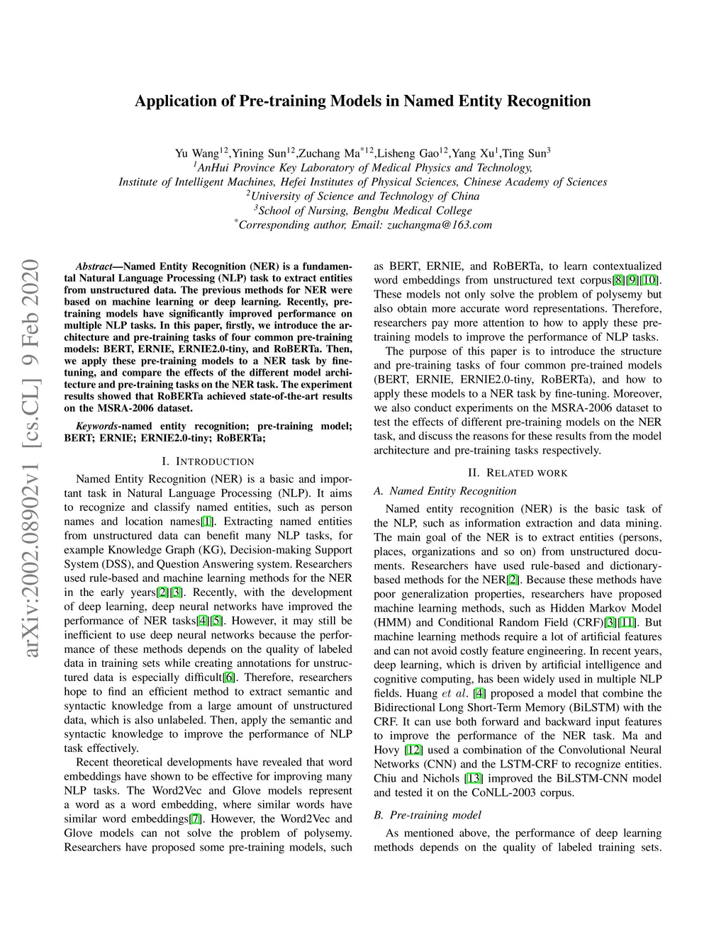 Named Entity Recognition (NER) is a fundamental Natural Language Processing (NLP) task to extract entities from unstructured data. The previous methods for NER were based on machine learning or deep learning. Recently, pre-training models have significantly improved performance on multiple NLP tasks. In this paper, firstly, we introduce the architecture and pre-training tasks of four common pre-training models: BERT, ERNIE, ERNIE2.0-tiny, and RoBERTa. Then, we apply these pre-training models to a NER task by fine-tuning, and compare the effects of the different model architecture and pre-training tasks on the NER task. The experiment results showed that RoBERTa achieved state-of-the-art results on the MSRA-2006 dataset.