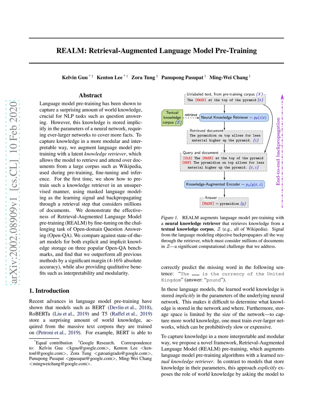 Language model pre-training has been shown to capture a surprising amount of world knowledge, crucial for NLP tasks such as question answering. However, this knowledge is stored implicitly in the parameters of a neural network, requiring ever-larger networks to cover more facts. To capture knowledge in a more modular and interpretable way, we augment language model pre-training with a latent knowledge retriever, which allows the model to retrieve and attend over documents from a large corpus such as Wikipedia, used during pre-training, fine-tuning and inference. For the first time, we show how to pre-train such a knowledge retriever in an unsupervised manner, using masked language modeling as the learning signal and backpropagating through a retrieval step that considers millions of documents. We demonstrate the effectiveness of Retrieval-Augmented Language Model pre-training (REALM) by fine-tuning on the challenging task of Open-domain Question Answering (Open-QA). We compare against state-of-the-art models for both explicit and implicit knowledge storage on three popular Open-QA benchmarks, and find that we outperform all previous methods by a significant margin (4-16% absolute accuracy), while also providing qualitative benefits such as interpretability and modularity.