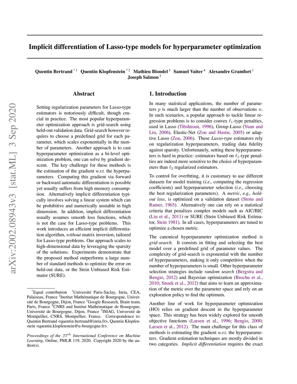 Setting regularization parameters for Lasso-type estimators is notoriously difficult, though crucial in practice. The most popular hyperparameter optimization approach is grid-search using held-out validation data. Grid-search however requires to choose a predefined grid for each parameter, which scales exponentially in the number of parameters. Another approach is to cast hyperparameter optimization as a bi-level optimization problem, one can solve by gradient descent. The key challenge for these methods is the estimation of the gradient with respect to the hyperparameters. Computing this gradient via forward or backward automatic differentiation is possible yet usually suffers from high memory consumption. Alternatively implicit differentiation typically involves solving a linear system which can be prohibitive and numerically unstable in high dimension. In addition, implicit differentiation usually assumes smooth loss functions, which is not the case for Lasso-type problems. This work introduces an efficient implicit differentiation algorithm, without matrix inversion, tailored for Lasso-type problems. Our approach scales to high-dimensional data by leveraging the sparsity of the solutions. Experiments demonstrate that the proposed method outperforms a large number of standard methods to optimize the error on held-out data, or the Stein Unbiased Risk Estimator (SURE).
