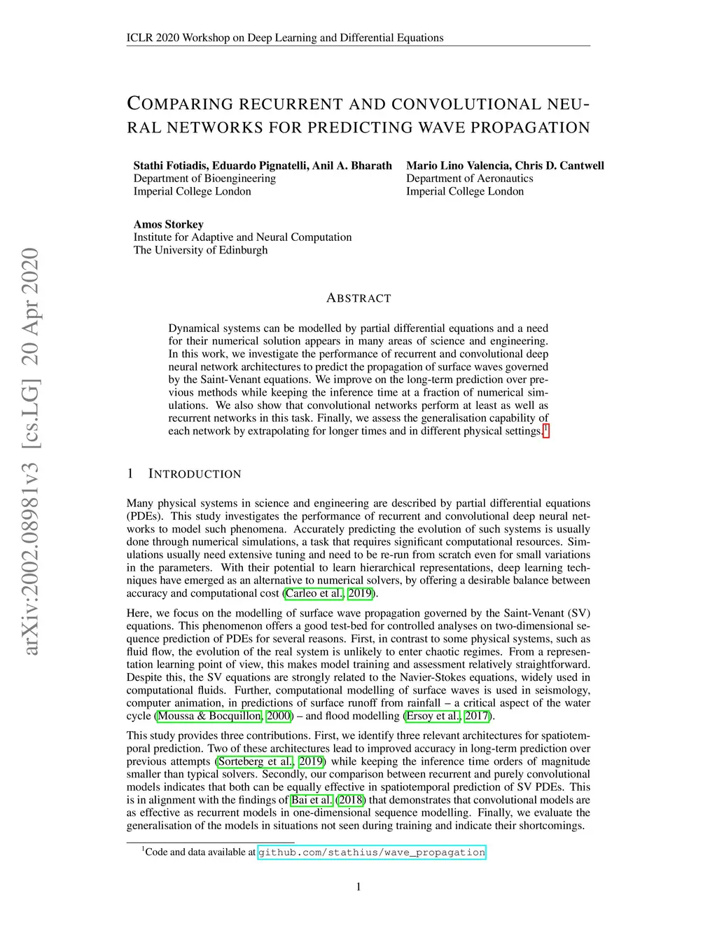 Dynamical systems can be modelled by partial differential equations and numerical computations are used everywhere in science and engineering. In this work, we investigate the performance of recurrent and convolutional deep neural network architectures to predict the surface waves. The system is governed by the Saint-Venant equations. We improve on the long-term prediction over previous methods while keeping the inference time at a fraction of numerical simulations. We also show that convolutional networks perform at least as well as recurrent networks in this task. Finally, we assess the generalisation capability of each network by extrapolating in longer time-frames and in different physical settings.