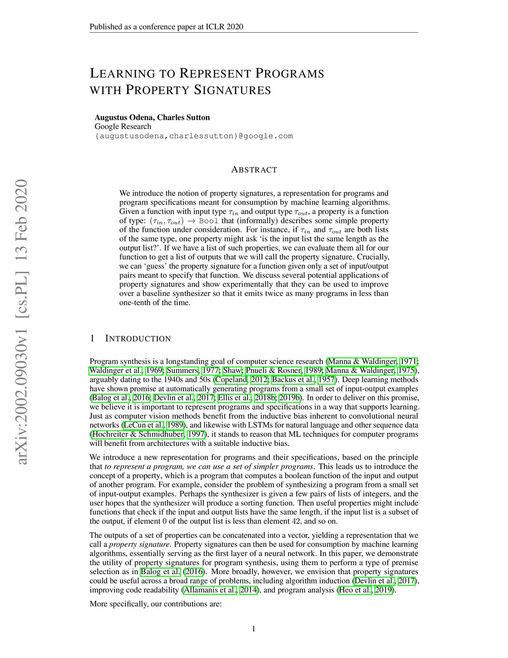 We introduce the notion of property signatures, a representation for programs and program specifications meant for consumption by machine learning algorithms. Given a function with input type and output type , a property is a function of type: that (informally) describes some simple property of the function under consideration. For instance, if and are both lists of the same type, one property might ask `is the input list the same length as the output list?'. If we have a list of such properties, we can evaluate them all for our function to get a list of outputs that we will call the property signature. Crucially, we can `guess' the property signature for a function given only a set of input/output pairs meant to specify that function. We discuss several potential applications of property signatures and show experimentally that they can be used to improve over a baseline synthesizer so that it emits twice as many programs in less than one-tenth of the time.